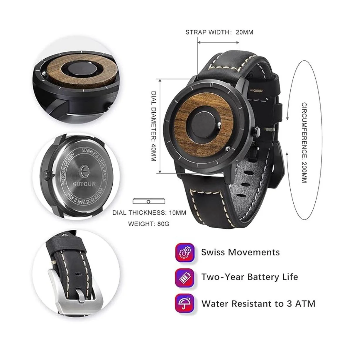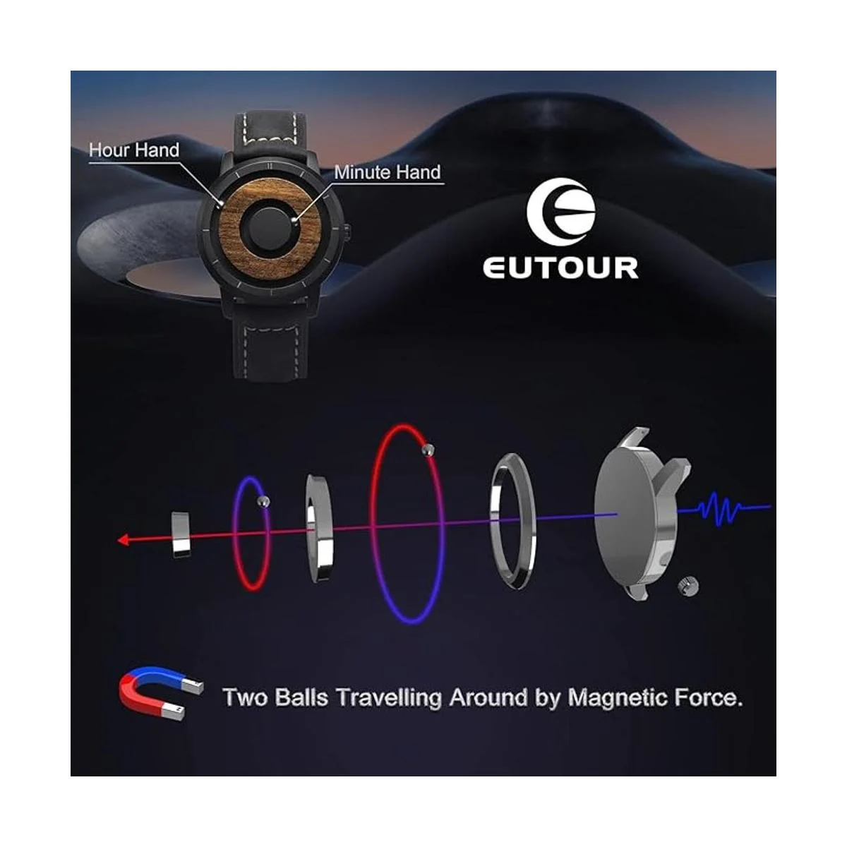 EUTOUR Relojes de madera para hombre, relojes magnéticos, analógicos, reloj de cuarzo suizo para hombre, caja de madera natural, malla de acero inoxidablecorrea de resina, 1.575 in