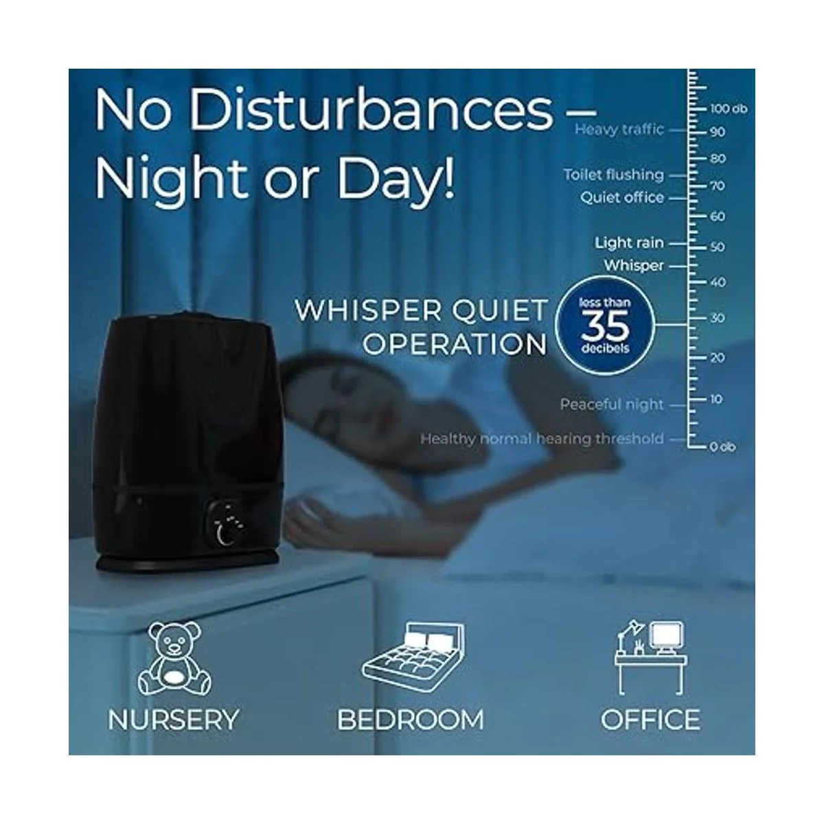 Whisper Quiet: Our large room humidifier is nearly silent less than 35 dB for no disturbances day or night. Unlike other humidifiers for home, ours shuts off automatically when water level is low, an essential safety feature for childrens rooms and bedrooms. Important: Try to keep humidity between 40 to 60 percent to avoid water accumulation