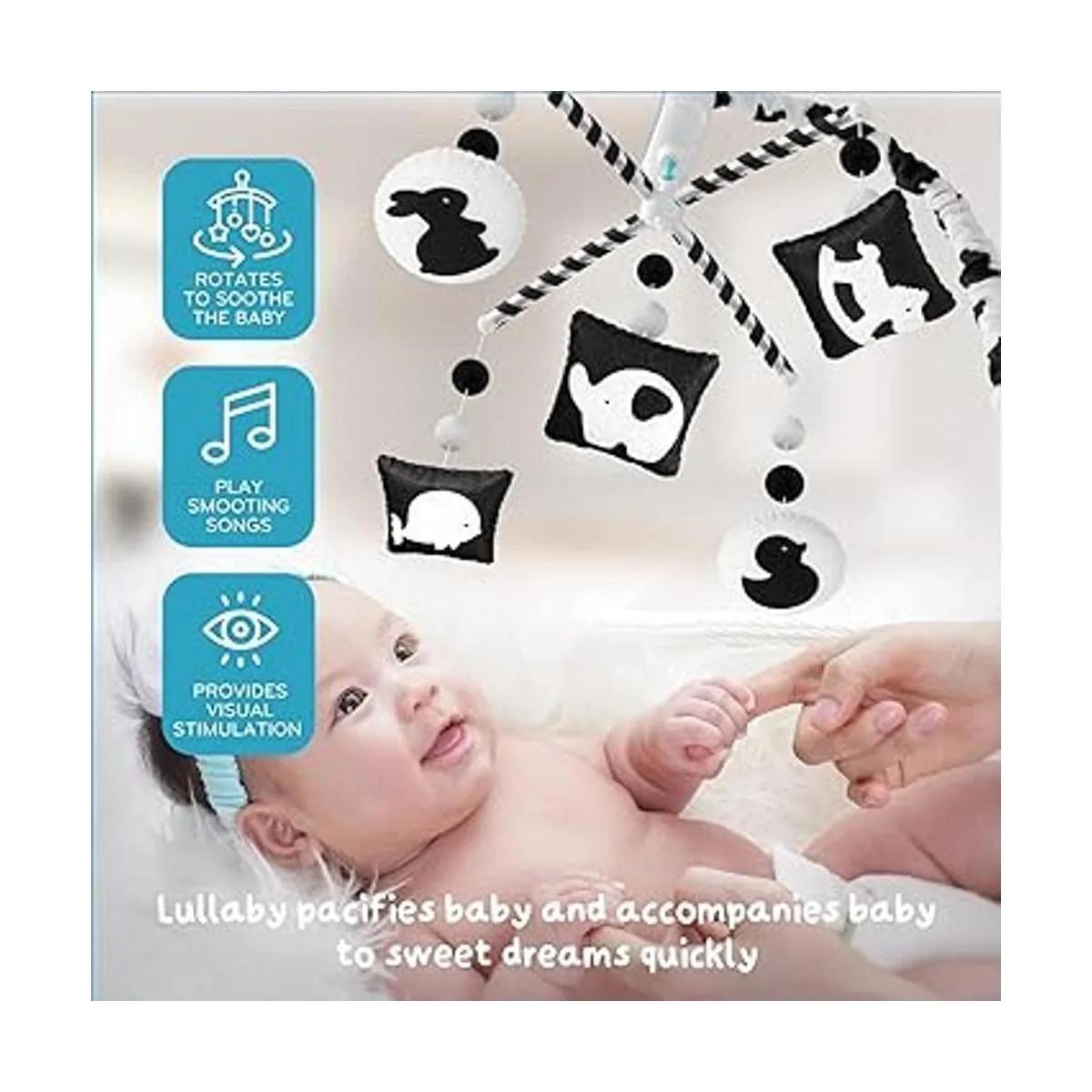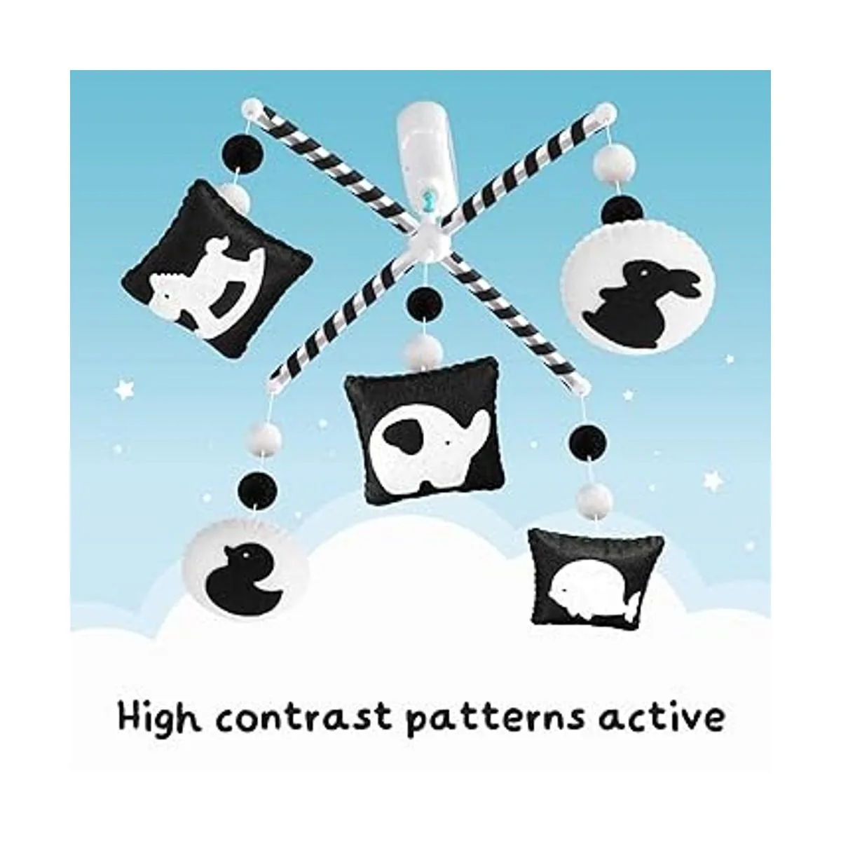 Estimula visual para bebés de 0 a 5 meses: introduce al bebé imágenes y colores de alto contraste para el desarrollo visual temprano con un móvil colgante sobre la cuna del pequeño. Los juguetes para cuna de bebé que se fijan a la cuna son juguetes para bebés de alto contraste con 5 animales diferentes elefante, ballena, caballo, pato y conejo que dan estimulación visual para involucrar a tu bebé.