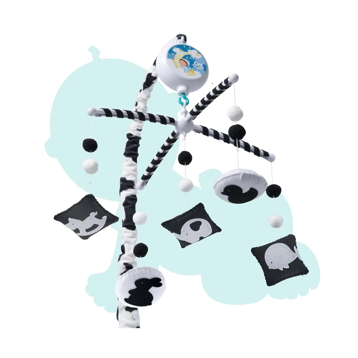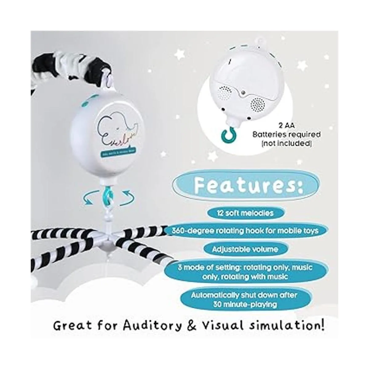 EVERLOVE | Montessori Mobile Baby para cuna | Caja de música digital con 12 canciones de cuna y 3 modos (solo rotación, solo música, rotación con música), móvil para bebés en blanco y negro para niños y niñas