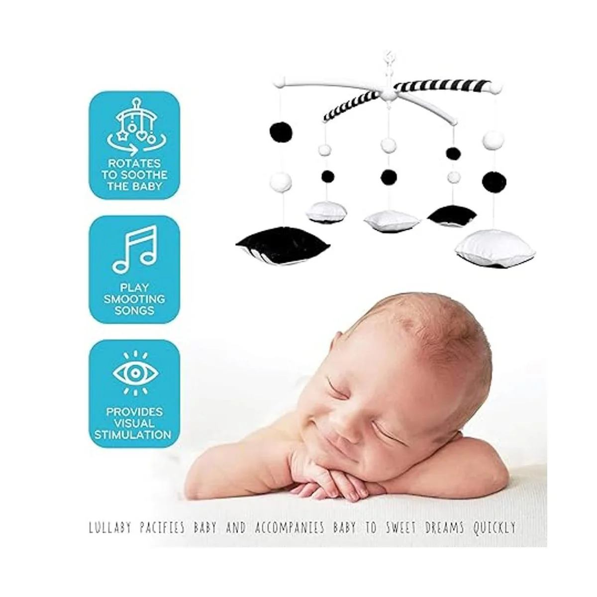 Estimula visual para bebés de 0 a 5 meses: introduce al bebé imágenes y colores de alto contraste para el desarrollo visual temprano con un móvil colgante sobre la cuna del pequeño. Los juguetes de cuna para bebé que se fijan a la cuna son juguetes de bebé de alto contraste con 5 formas diferentes que dan estimulación visual para involucrar a tu bebé.