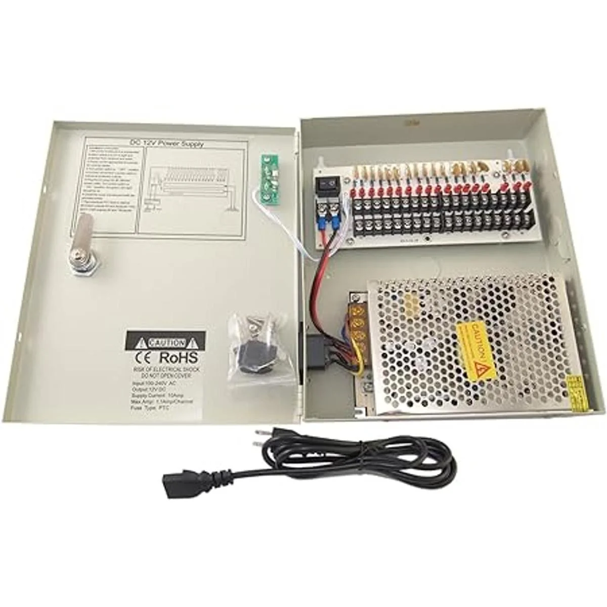 Caja de distribución de fuente de alimentación de cámara de seguridad de 18 canales con palillos macho CC y cerradura de llave