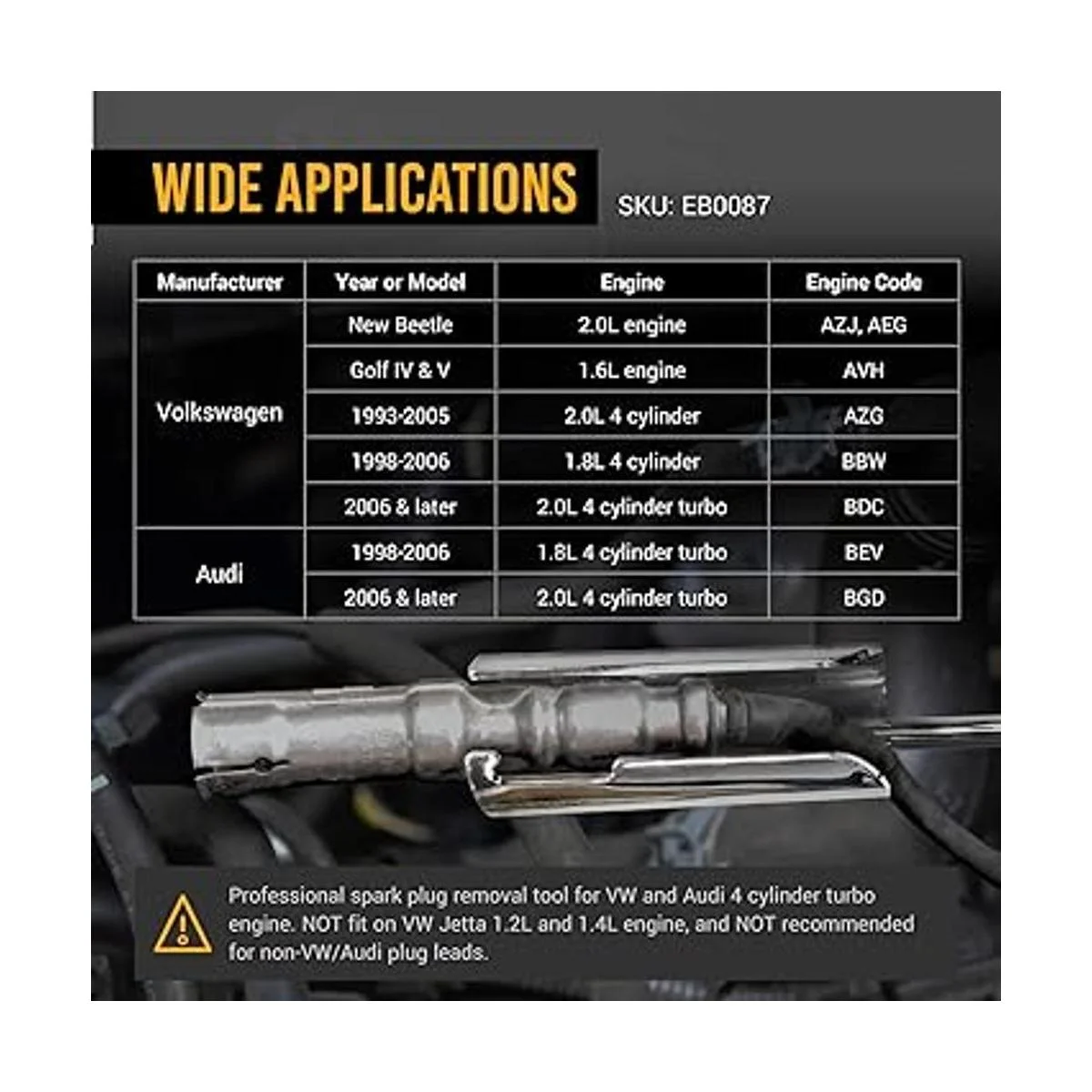 Aplicaciones: Volkswagen Nuevo motor Beetle 2.0 AZJ AEG, Golf IV V 1.6 motor AVH, 19932005 2.0L 4 cilindros AZG, 19982006 1.8L 4 cilindros BBW, 2006 y posteriores 2.0L 4 cilindros turbo BDC. ; Audi 1. 9982006 1.8L 4 cilindros turbo BEV, 2006 y posteriores 2.0L 4 cilindros turbo BGD. No se recomienda para cables de enchufe no VW/Audi.