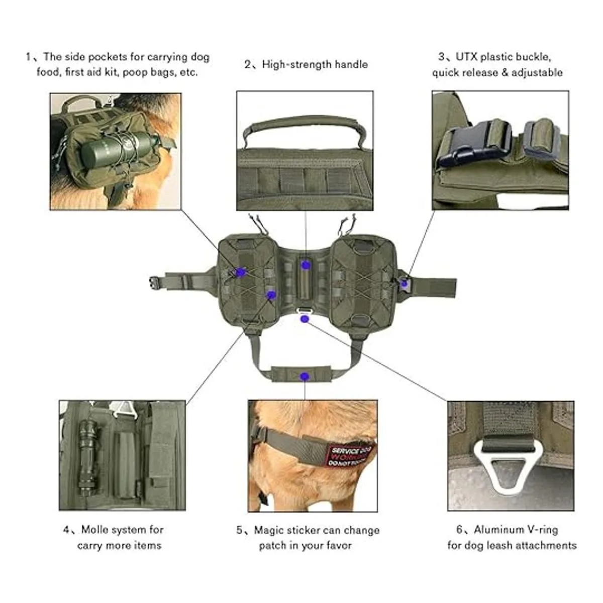Las mochilas para perros para senderismo, las correas delanteras pueden ajustar el cuello de los perros y las correas ajustables del vientre con hebilla de liberación rápida UTXDuraflex; el sistema Molle en la parte posterior puede añadir más artículos que desees; la mochila de senderismo para perro puede cambiar los parches de acuerdo a tu favor.