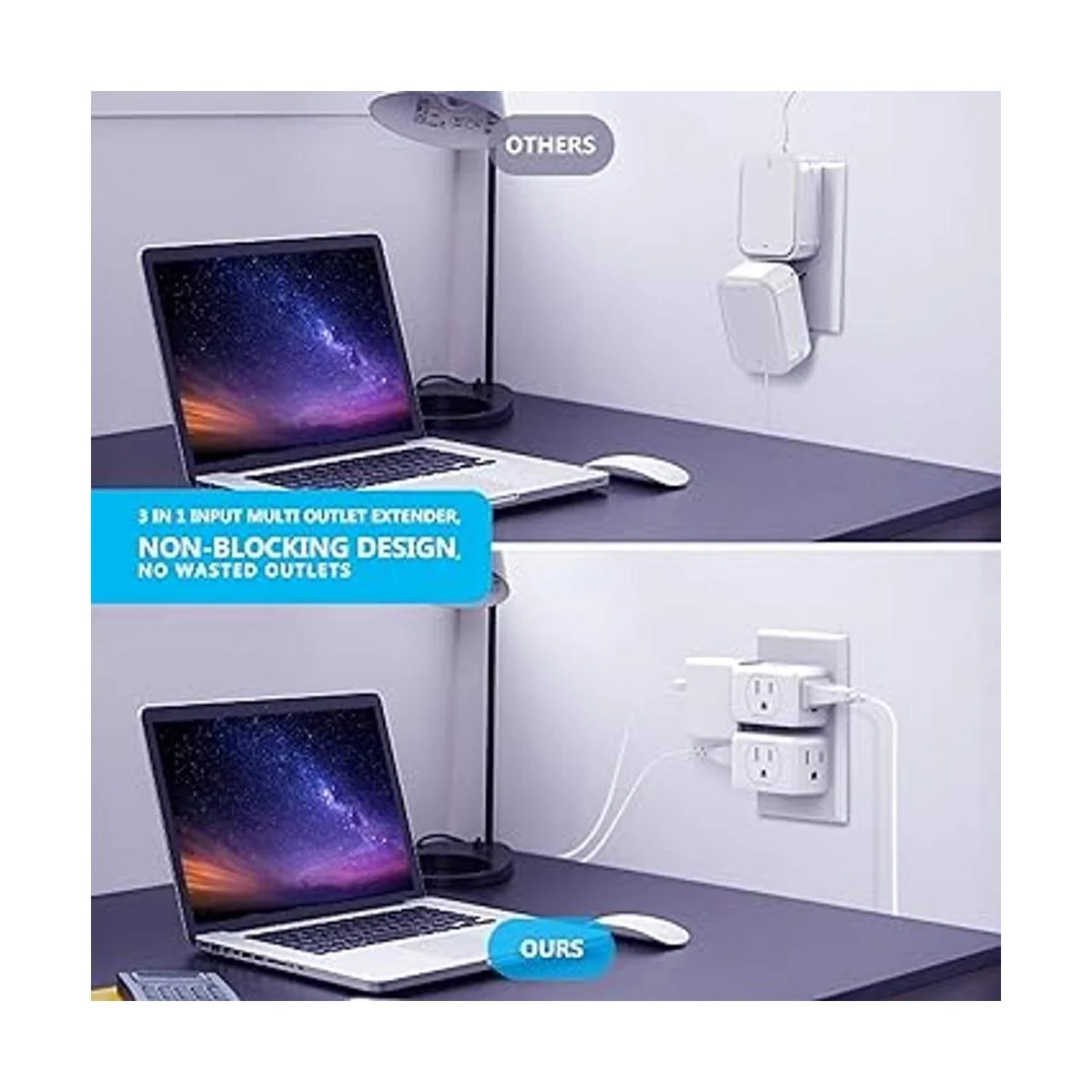 Ahorro de espacio: este extensor de toma eléctrica es de tamaño mini: 2.5 x 1.5 x 1.2 pulgadas, diseño compacto y ligero que cabe en equipaje y maletines. Este divisor de enchufe ocupa solo una sola toma en tu panel de pared, se coloca en la toma de corriente superior y todavía tienes suficiente espacio para ser utilizado, perfecto para uso en interiores o incluso viajes. Mantén menos enredos de cables en el dormitorio, dormitorio, oficina y sala de estar.