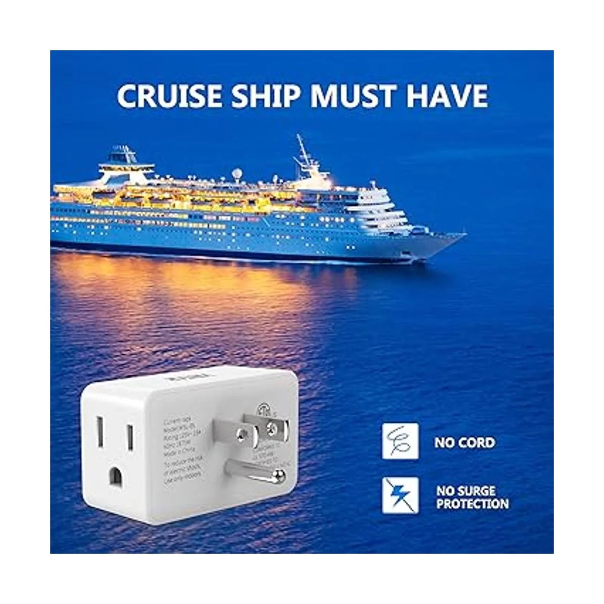 Imprescindible para el crucero: la mayoría de los cruceros no permiten regletas eléctricas protegidas contra sobretensiones a bordo por razones de seguridad. Este extensor de enchufe no tiene protección contra sobretensiones, sin cables, por lo que es totalmente aprobado por crucero.