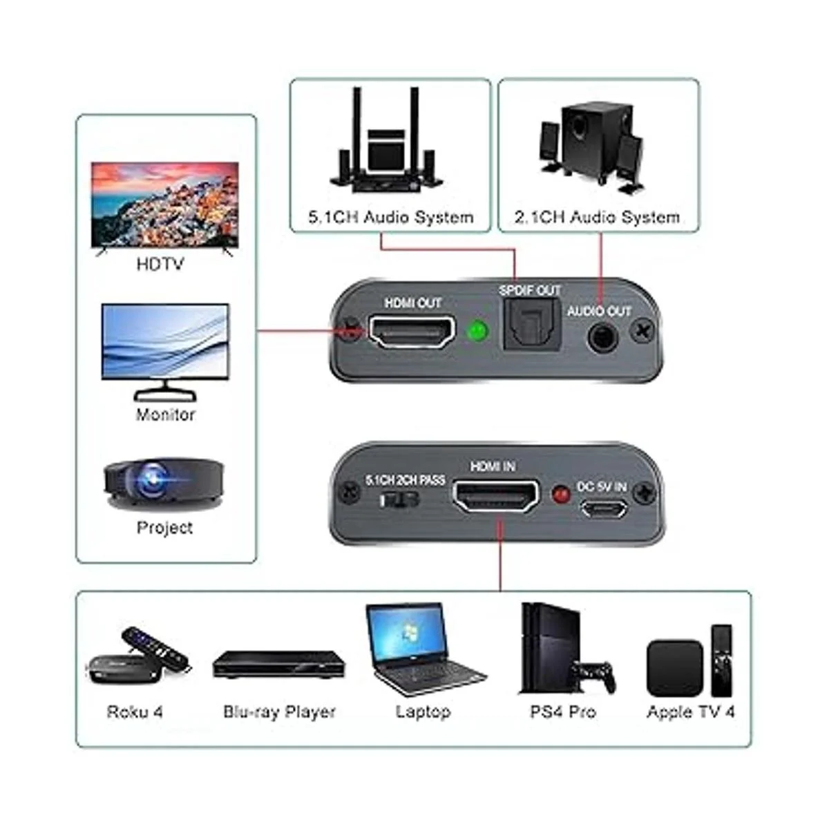 Extractor de audio HDMI 4K, Hdiwousp HDMI a HDMI Audio óptico estéreo de 0.138 in, convertidor de audio HDMI con cable HDMI a Toslink SPDIF salida AUX soporte HDCP1.4 3D para PS4RokuBulRay