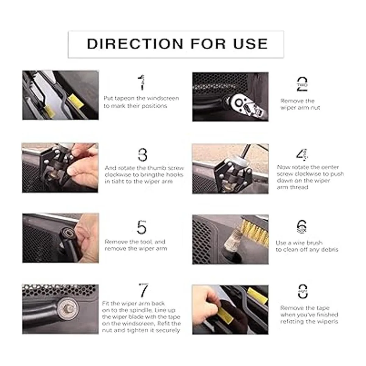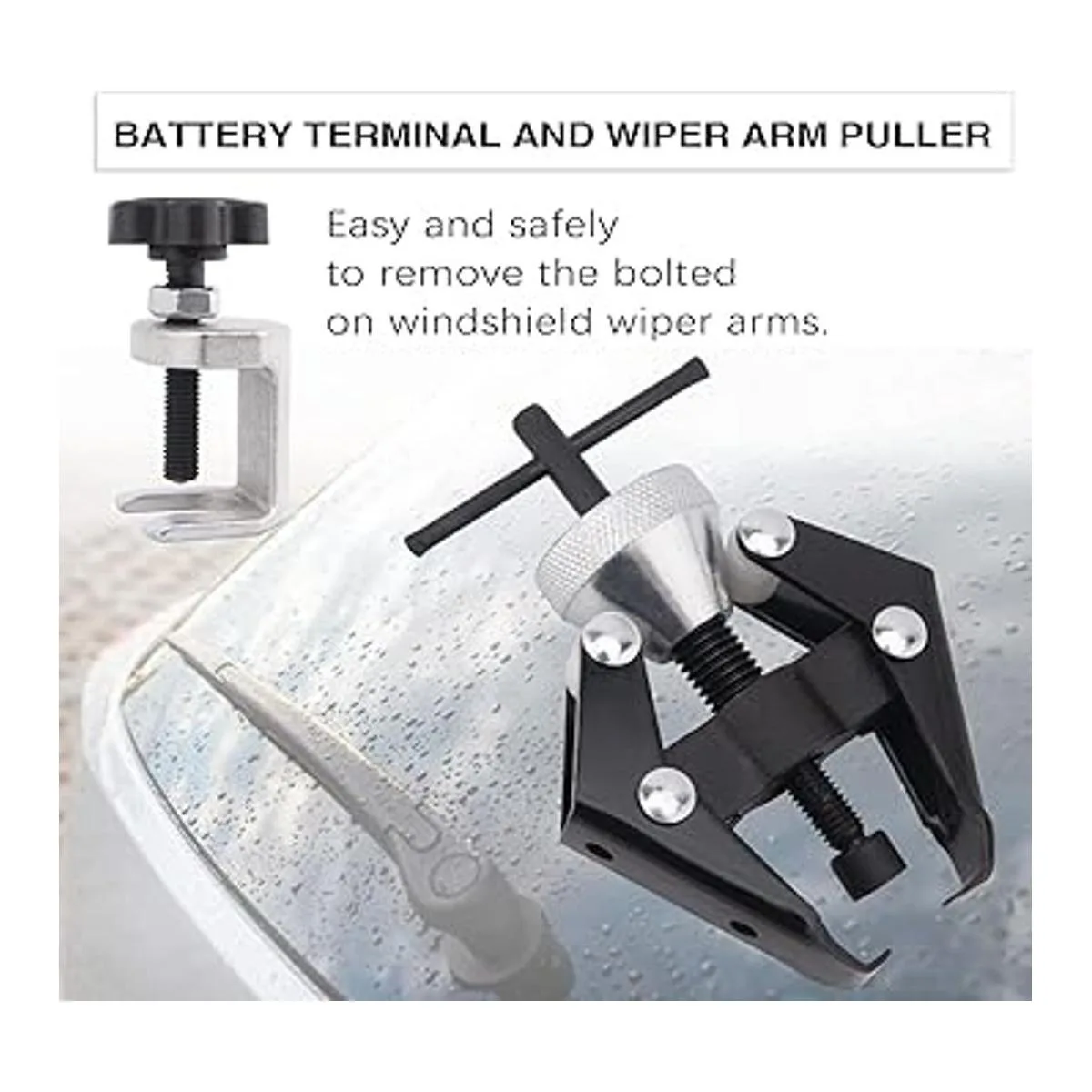 Fácil de usar: coloca el pie de la herramienta de extracción del brazo del limpiaparabrisas para sujetarlo de forma segura al brazo del limpiaparabrisas, y luego aprieta el tornillo central de giro o aprieta el tornillo fuerte en el eje del limpiaparabrisas para quitar el brazo del limpiaparabrisas
