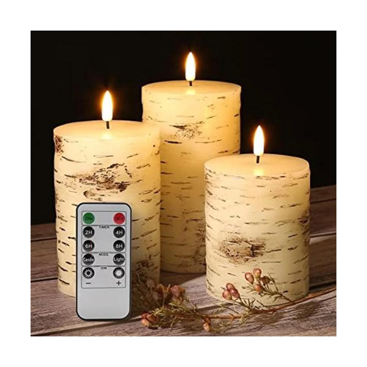 Velas de abedul remotas: el control remoto funciona para las 3 velas, lo que permite encender, ajustar temporizador de 2/4/6/8/24 horas, ajustar el brillo, ajustar el parpadeo o llama estática. Alcance remoto máximo de 20 pies.