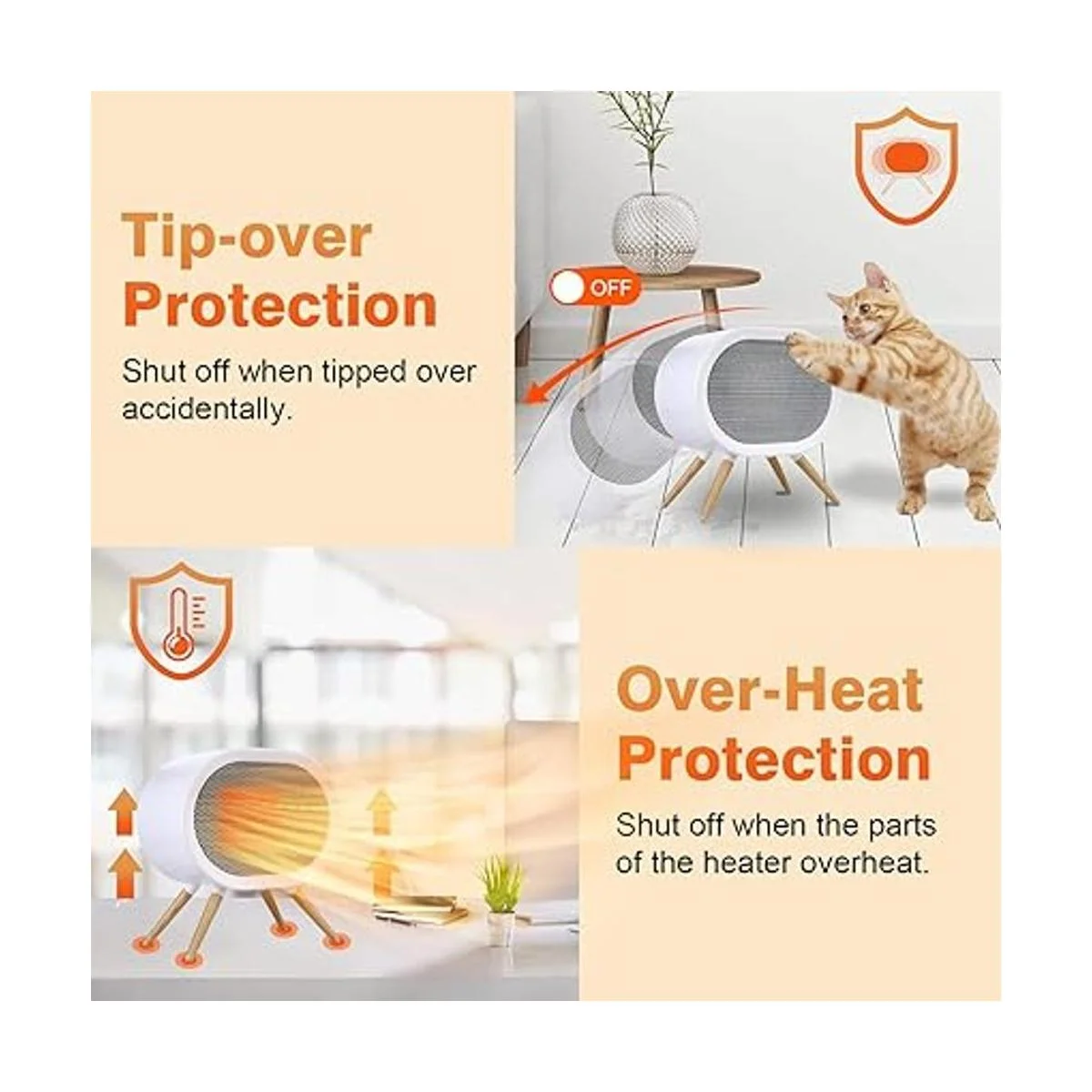 Más seguro de usar: la función de seguridad es imprescindible, nuestro calentador de espacio viene con apagado automático cuando se inclina accidentalmente y protección contra sobrecalentamiento, lo que es extremadamente importante para cualquier casa que tenga mascotas, el calentador se apaga después de 6 horas de uso para proteger la placa de calefacción. La última pata de plástico mejorada de 4 patas con diseño de silicona antideslizante inferior es más estable que tres patas, ya no se cae fácilmente. Más seguro de usar