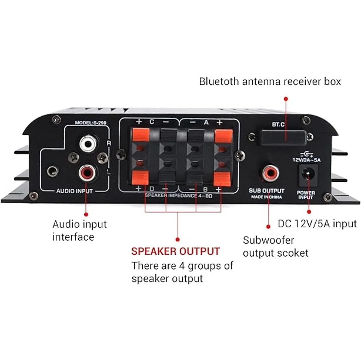 Facmogu S299 Amplificador de potencia Bluetooth de 40 W x 4 con salida de subwoofer activo máximo de 800 W 4.1 canales amplificador de subwoofer integrado de alta fidelidad mini altavoz amplificador de audio subgraves control remoto y fuente de alimentación de 12 V