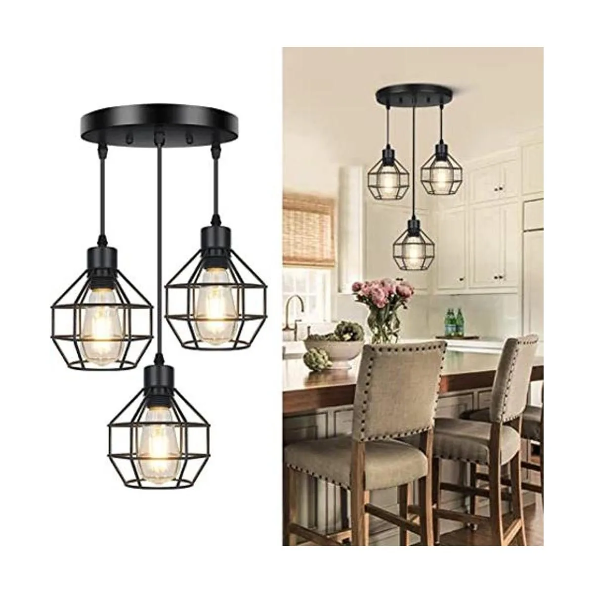 Estilo simple y amplia aplicación: estas lámparas colgantes de comedor de 3 luces están diseñadas con tres pantallas de jaula calada con acabado negro, emiten un amplio brillo para iluminar toda la habitación, proporcionan un atractivo vintage para tu espacio. Esta lámpara colgante de granja es perfecta para una variedad de estilos de decoración que van desde industrial vintage hasta rústico moderno, especialmente dormitorio, sala de estar, comedor, cocina, pasillo, bar, cafetería, granja, vestíbulo, loft y cualquier sala de estar.
