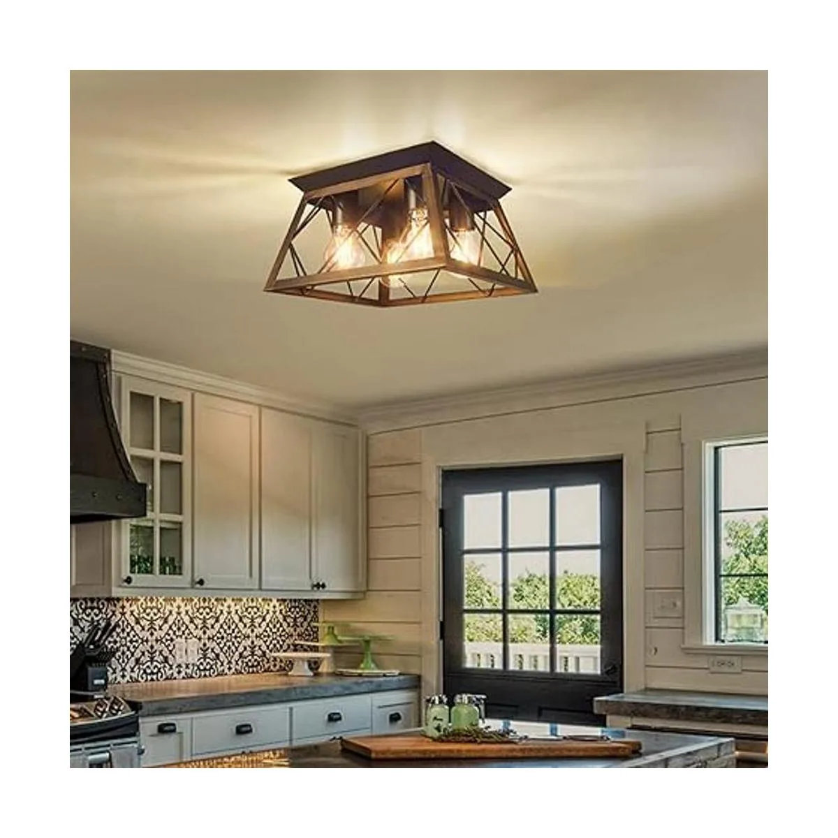 Adecuado para varias ocasiones: esta lámpara de techo rústica de granja utiliza un diseño de estilo rústico, luz de color cálido para un efecto más suave, perfecta para granja, cocina, comedor, pasillo, vestíbulo, entrada, dormitorio, fregadero, mesa de comedor, cafetería, restaurante, almacén, etc. Las lámparas de montaje empotrado negras con un diseño de jaula geométrica abierta que permite que la luz llegue a toda la zona y irradie un reconfortante brillo campestre.