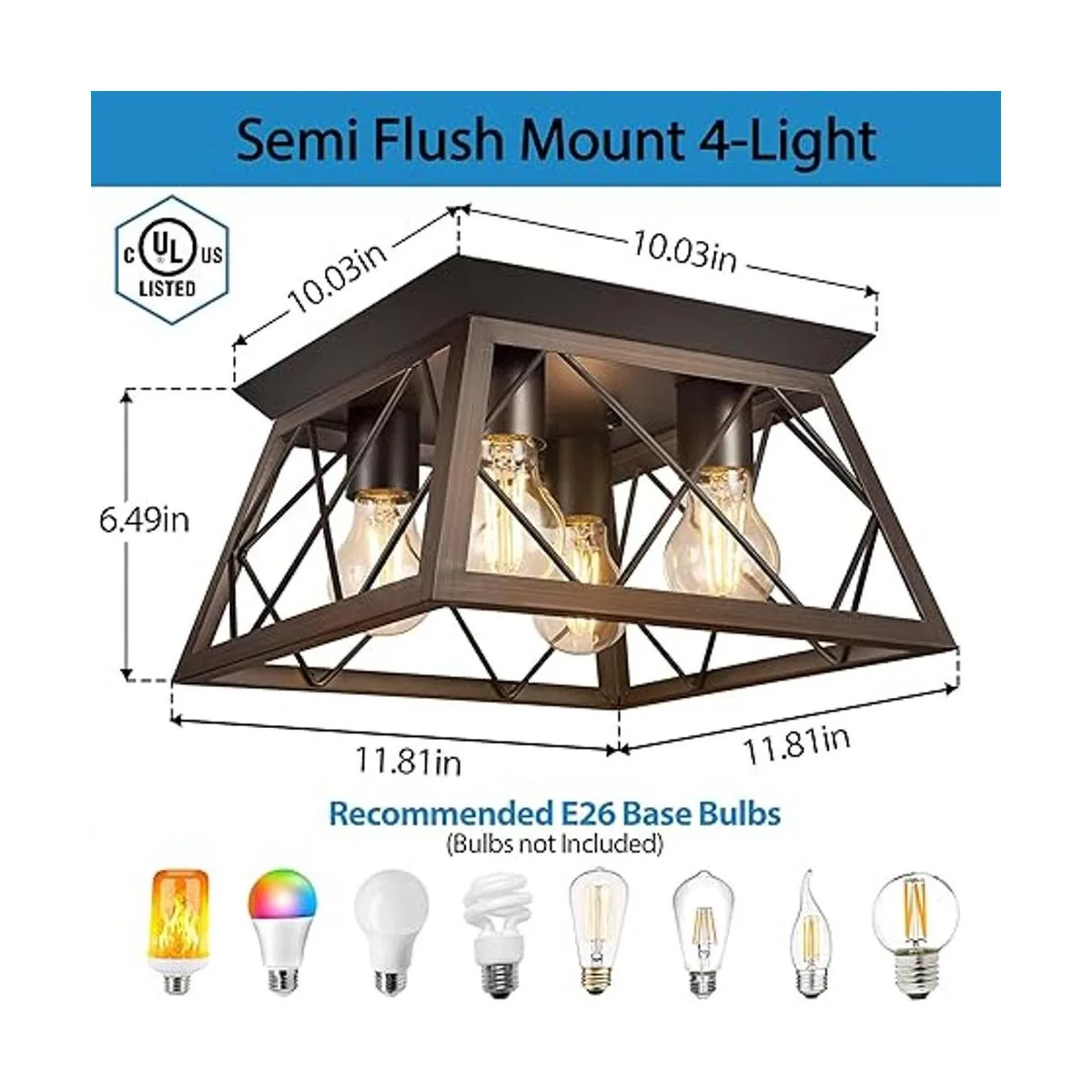 Diseño de estilo industrial y granja: esta lámpara de montaje semiempotrada de 4 luces de granja cuenta con un marco de madera maciza y toldo de metal marrón oscuro, que encarna el encanto encantador de la industria retro y moderna. La lámpara de techo cercana proporciona un aspecto industrial y rústico que añadirá un toque vintage a tu espacio, crea efectos de iluminación llamativos para el techo de tu hogar.