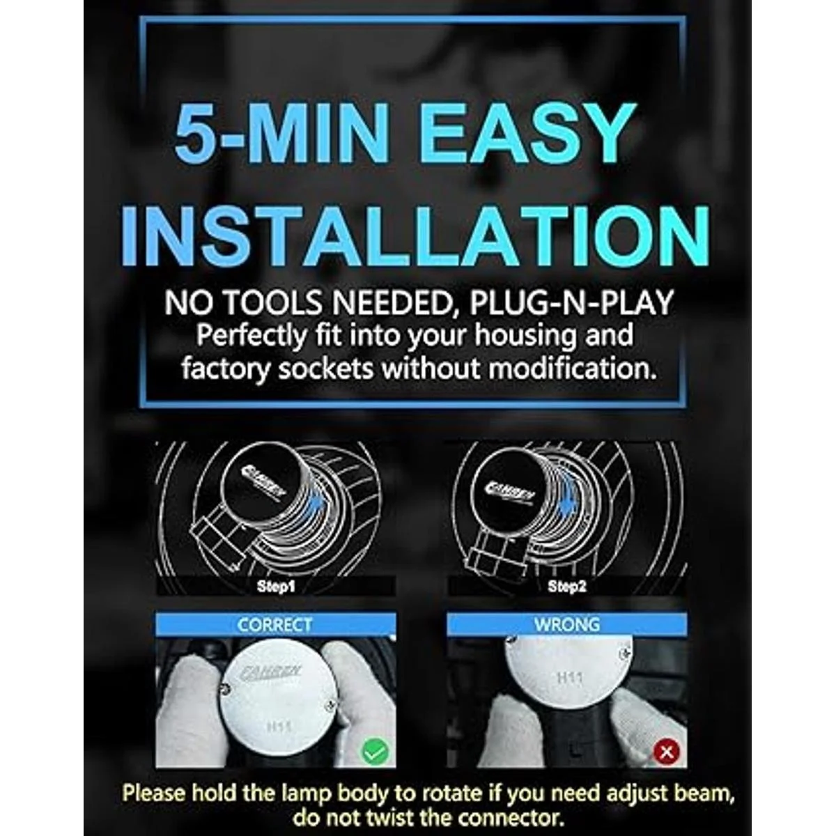 Fácil instalación en 5 minutos: no se necesitan herramientas para reemplazar la luz antiniebla H11 de diseño 1:1. Se adapta perfectamente a tu carcasa y enchufes de fábrica sin ninguna modificación. Equipado con un anillo adaptador ajustable de 360 que hace que la instalación sea muy fácil.