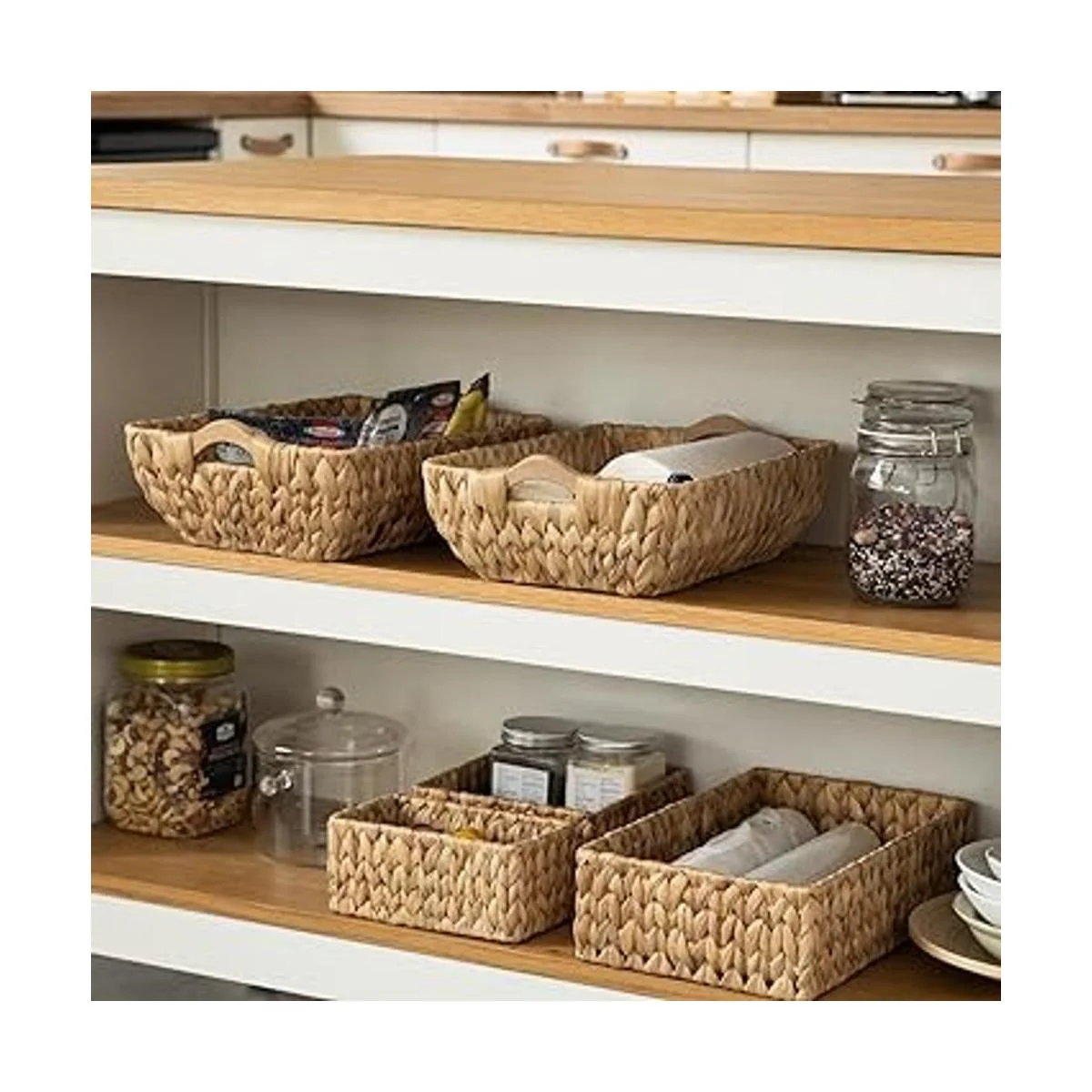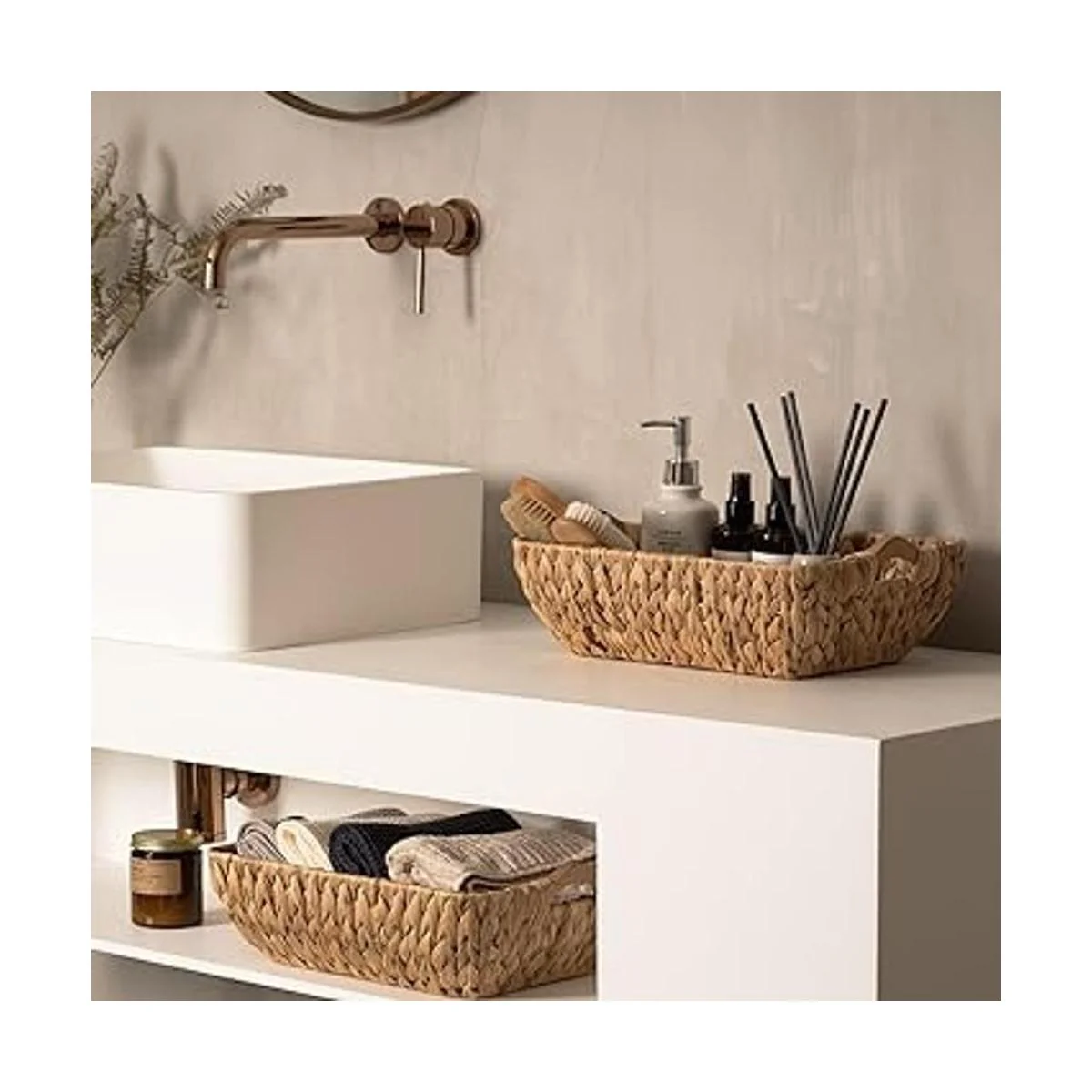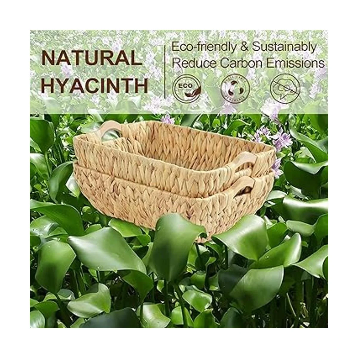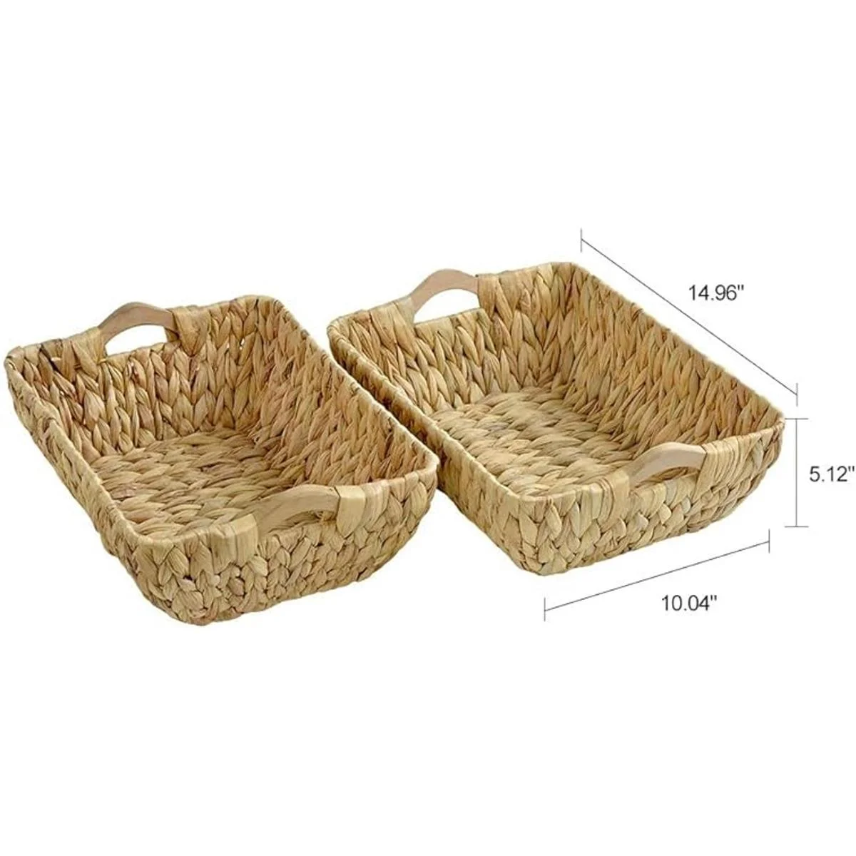 FairyHaus Juego de 2 cestas de mimbre con asas, cesta de mimbre natural para organizar estantes, pequeñas cestas de almacenamiento de jacinto de agua tejidas a mano, 14.96 x 10.04 x 5.12 pulgadas