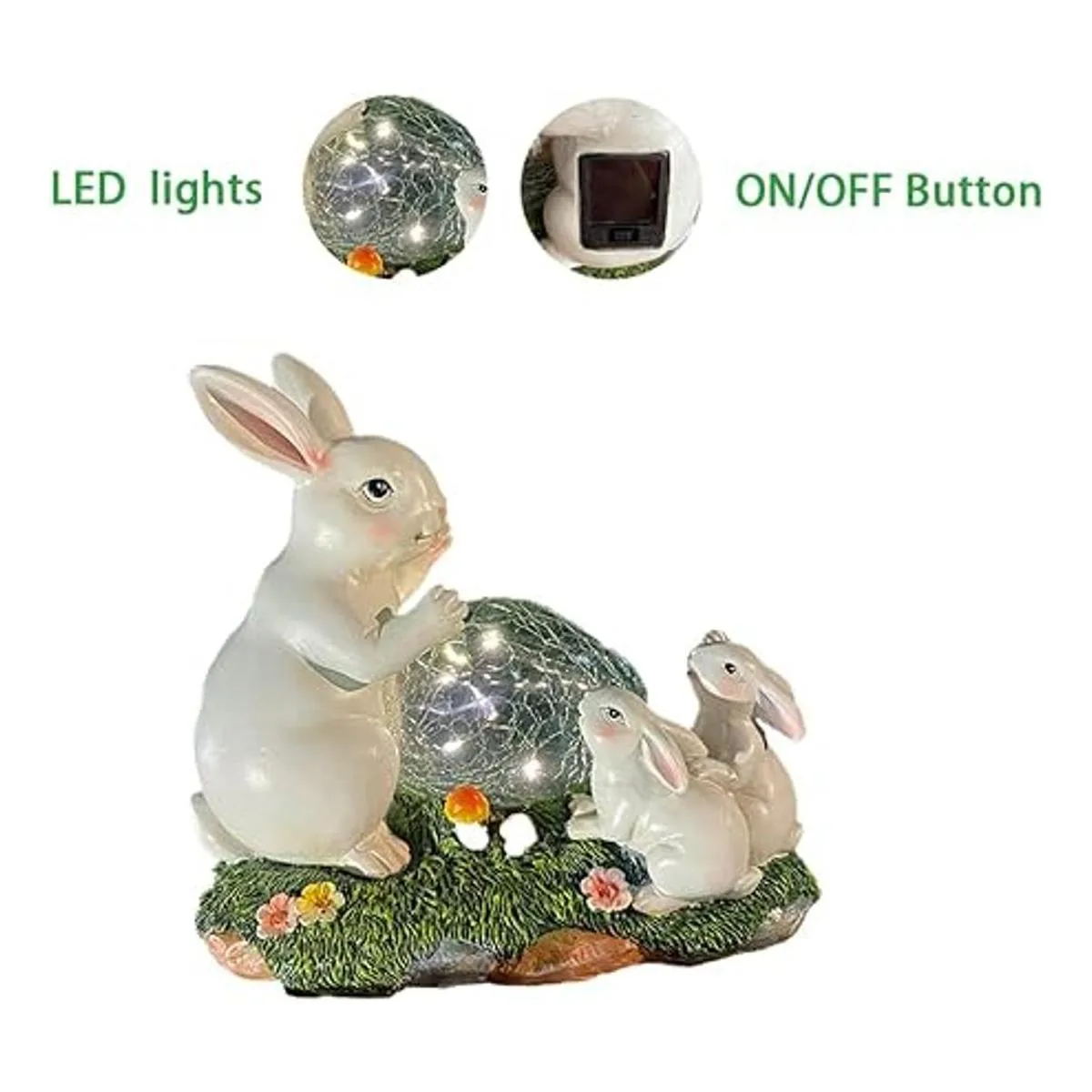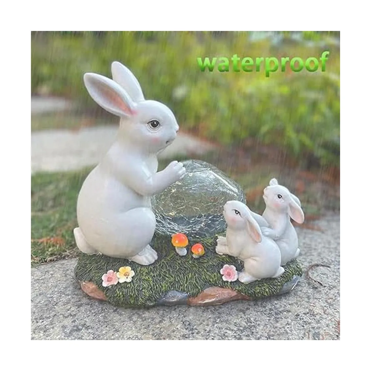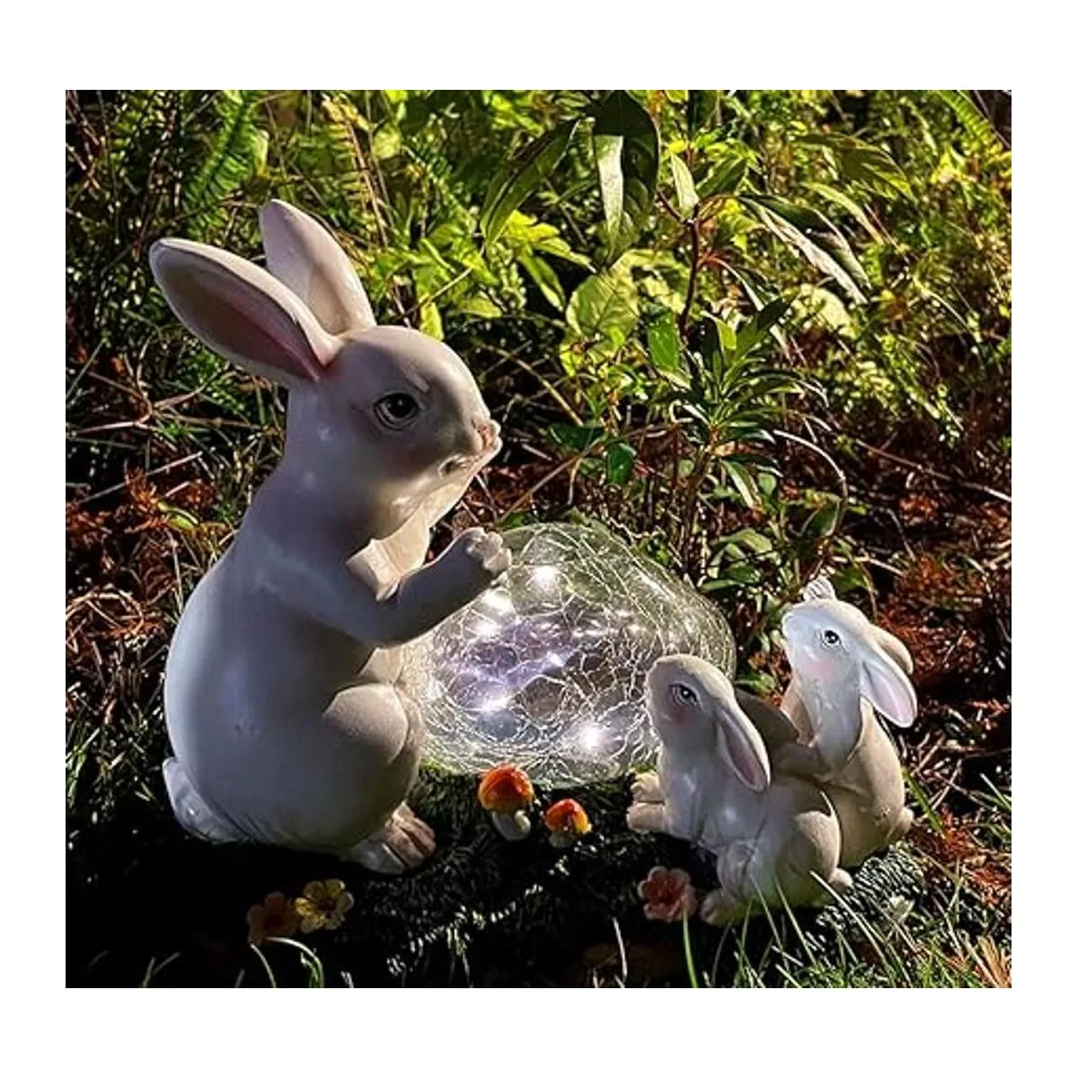 Bonita decoración de jardín de conejitos solares: añade un color vibrante a tu patio trasero. Conejito mamá y niños encontraron esta bola con energía solar en un hermoso césped decorado con flores y setas, les encanta, también lo harás.