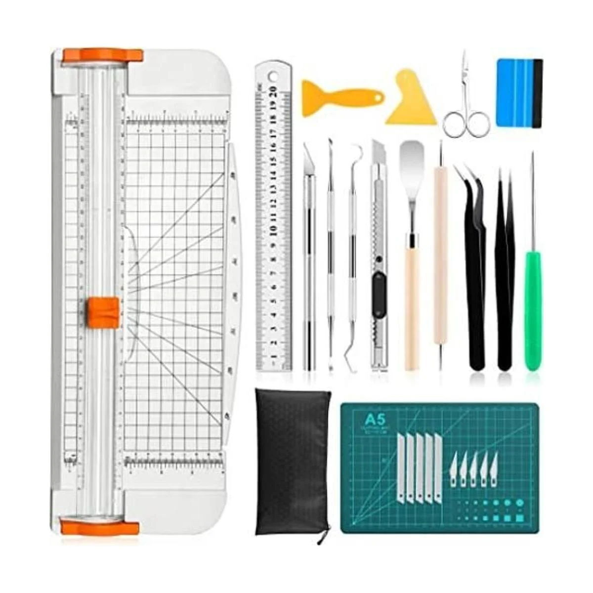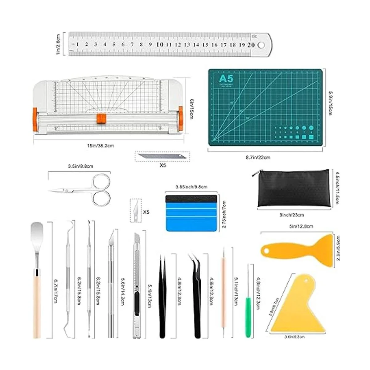Lo que obtendrás: las herramientas de desmalezado para vinilo incluyen: 2 pinzas, una rebanada triangular, 2 espátulas, un bolígrafo de trazado, 3 desbrozadoras de gancho, una tijera de acero inoxidable, un punzón, 3 raspadores, una regla, 10 cuchillas, un cuchillo de pasatiempo, una tabla de cortar, una bolsa de cremallera negra A5. El juego básico completo de manualidades puede satisfacer todas tus necesidades de manualidades.