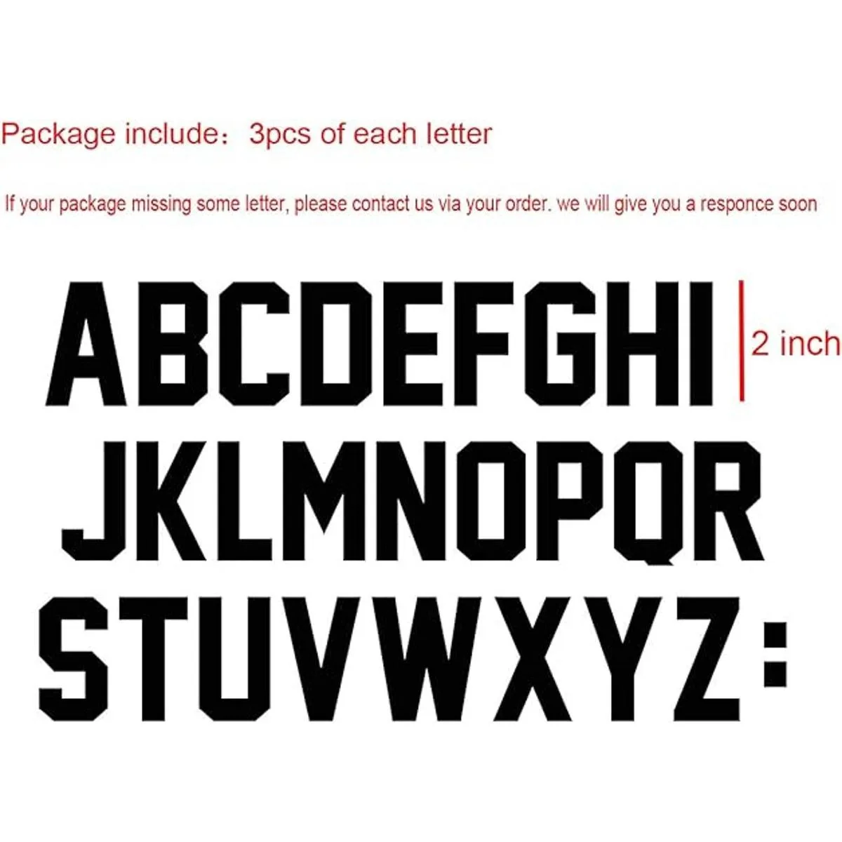 Recibirás un total de 78 letras de transferencia de calor, 3 piezas de cada letra. Tamaño: 2.0 in de alto. Color: negro