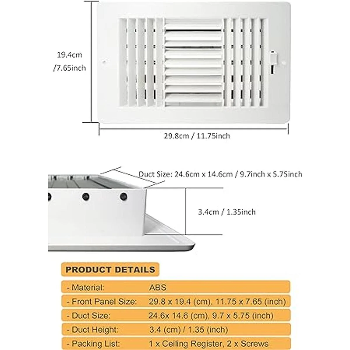 Tamaño del producto: comprueba el tamaño de tu conducto cuadrado antes de comprar. Asegúrate de que tus dimensiones coincidan con nuestras dimensiones del conducto trasero. Tamaño del panel: 11.811 in x 7.874 in. Tamaño del conducto trasero: 9.843 in x 5.906 in. Altura del conducto: 1.299 in. Embalado con dos tornillos por favor, comprueba antes de la instalación.
