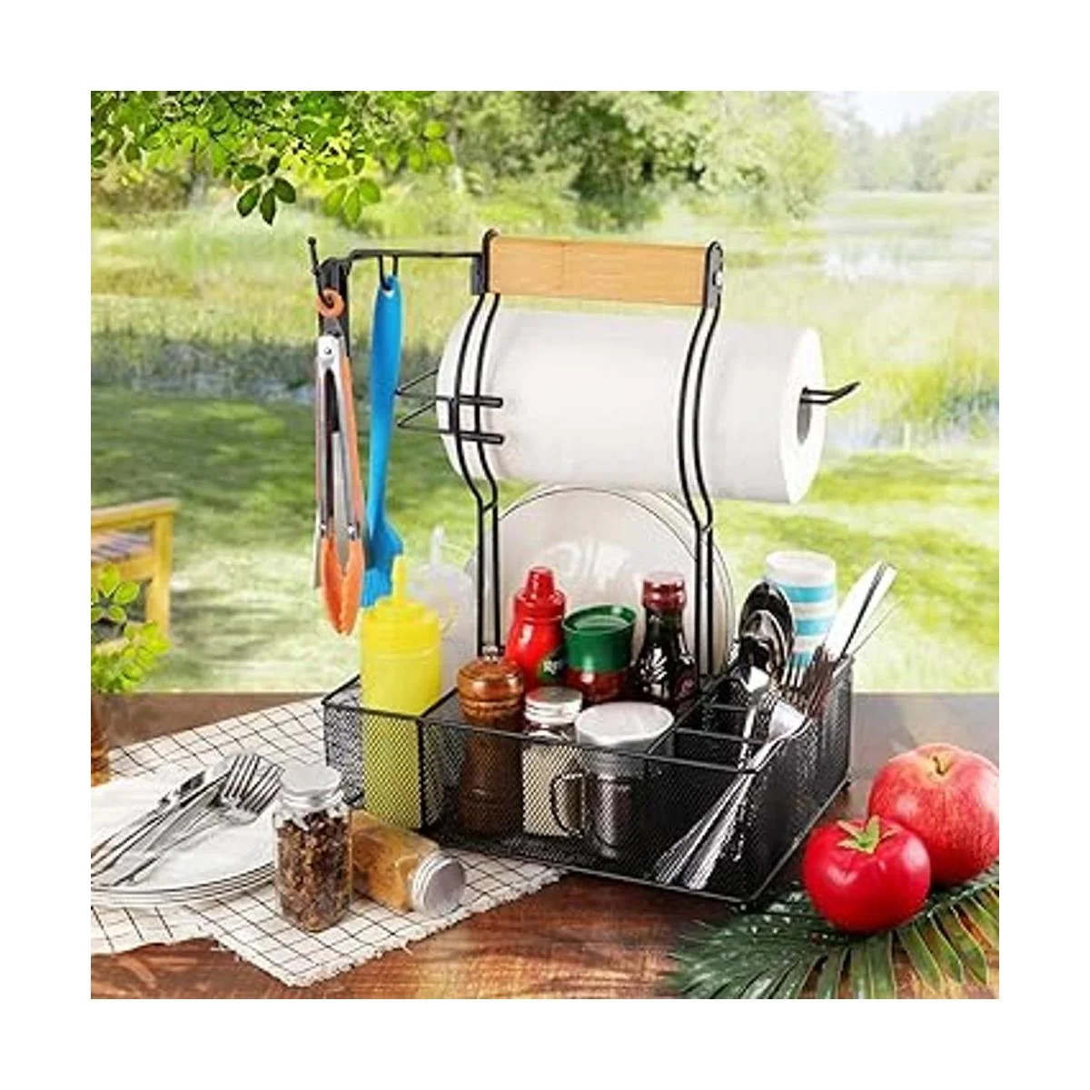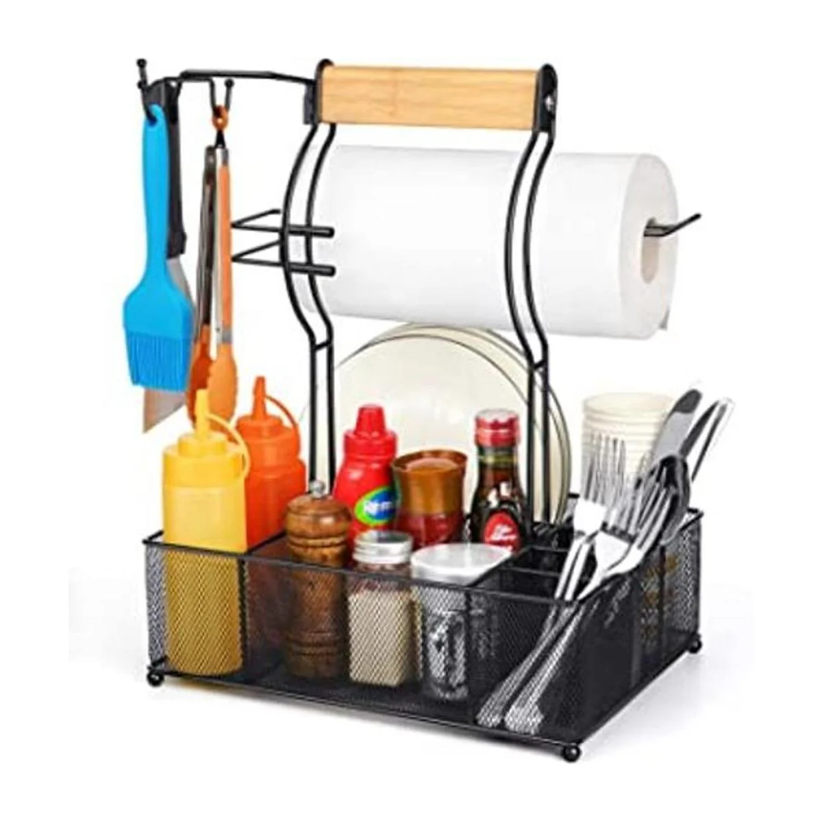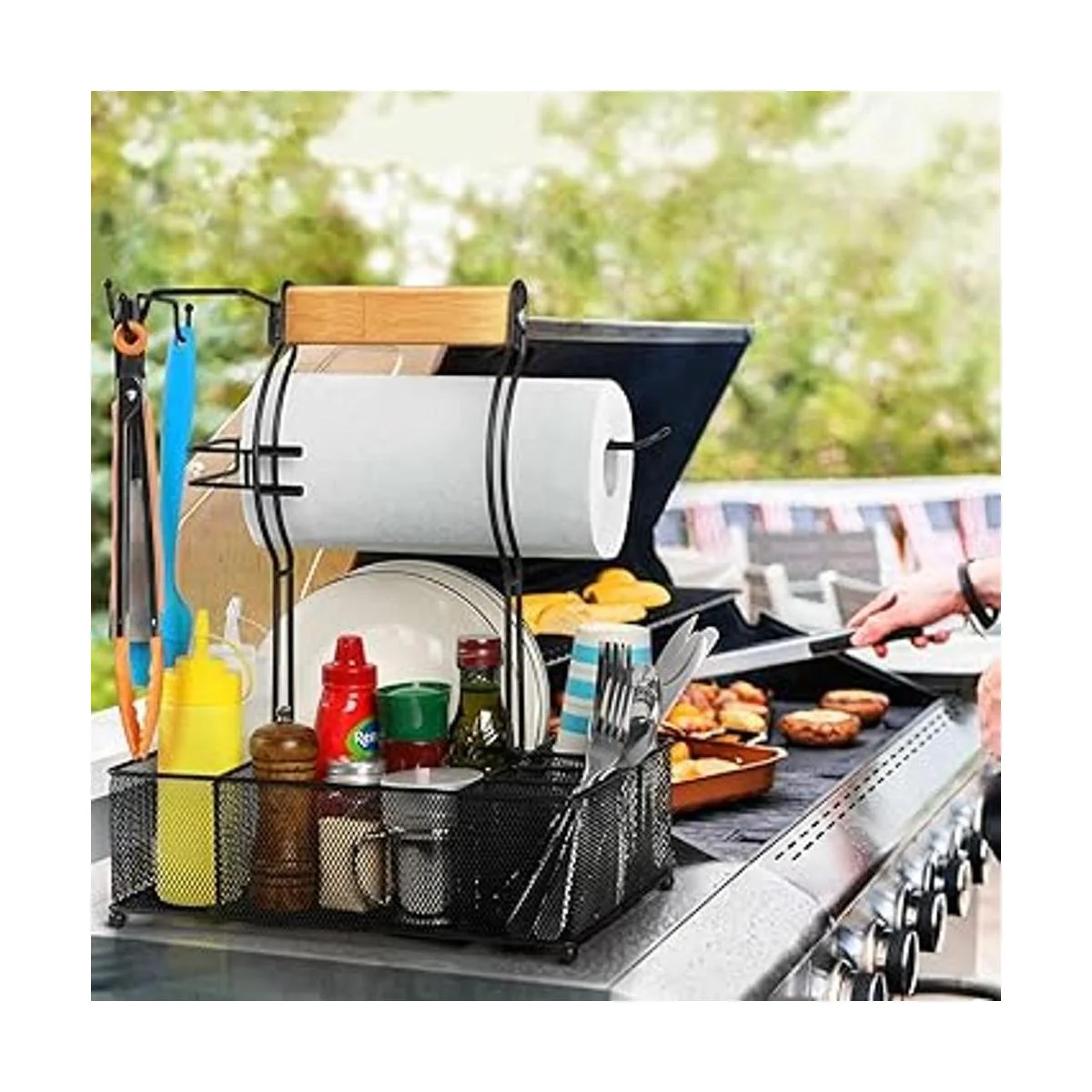 FANGSUN Organizador grande para utensilios de parrilla, organizador de barbacoa para acampar al aire libre, cesta de malla con 3 ganchos para colgar y soporte para toallas de papel, herramientas de almacenamiento de mesa ideales para cubiertos de platos de papel