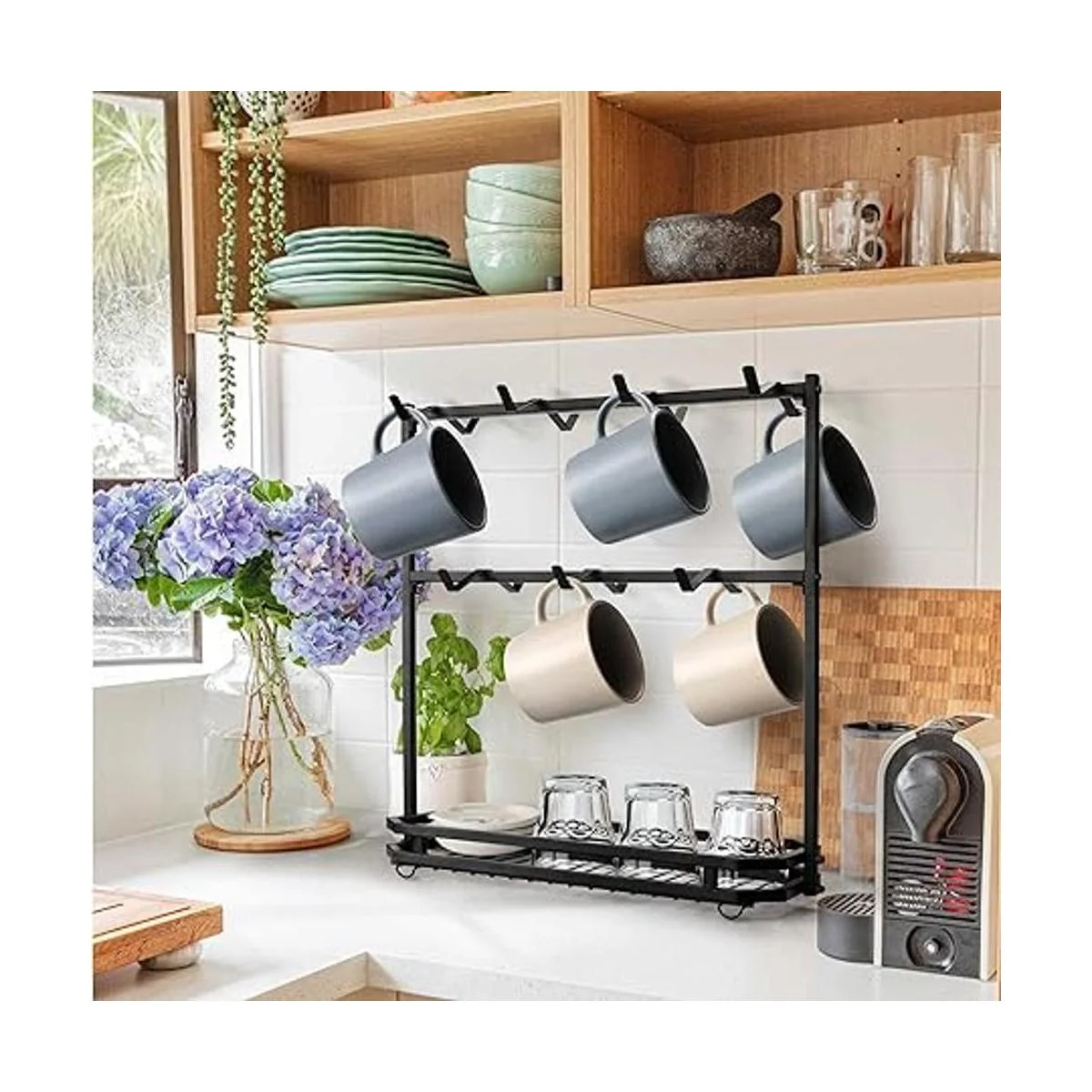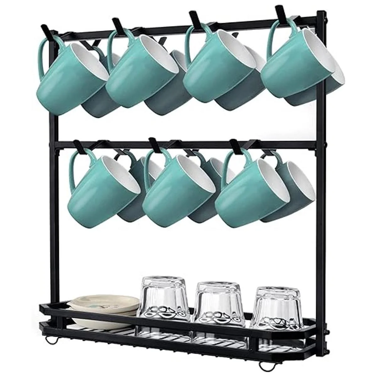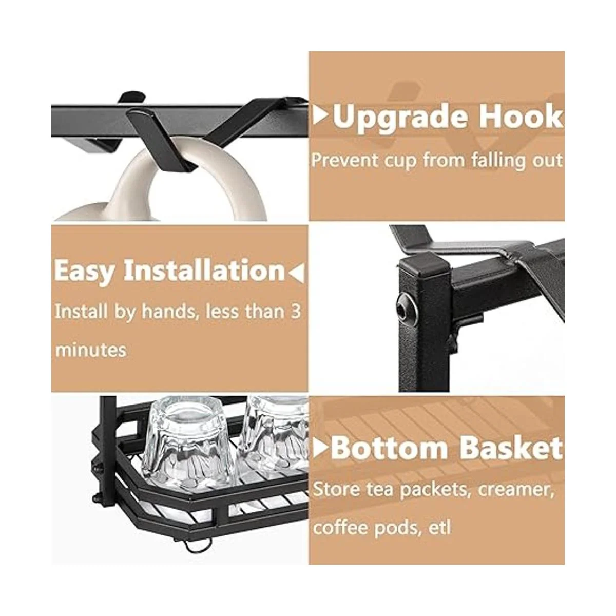 Soporte grande para tazas de café: capacidad para hasta 14 tazas, estante para tazas de 2 niveles con cesta. Cesta inferior apta para almacenar bolsas de té, cápsulas de café, crema, paquetes de té, azúcar, edulcorantes, cápsulas de café, agitadores y mucho más. Diseño de riel para evitar que las cosas pequeñas se caigan, mantiene la esquina de tu estación de café organizada y ordenada. Nota: solo soporte para tazas. No incluye tazas en la imagen