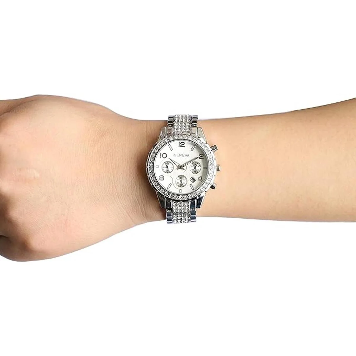 Fanmis lujoso reloj pulsera de acero inoxidable con calendario, de plata, cristal y cuarzo, unisex
