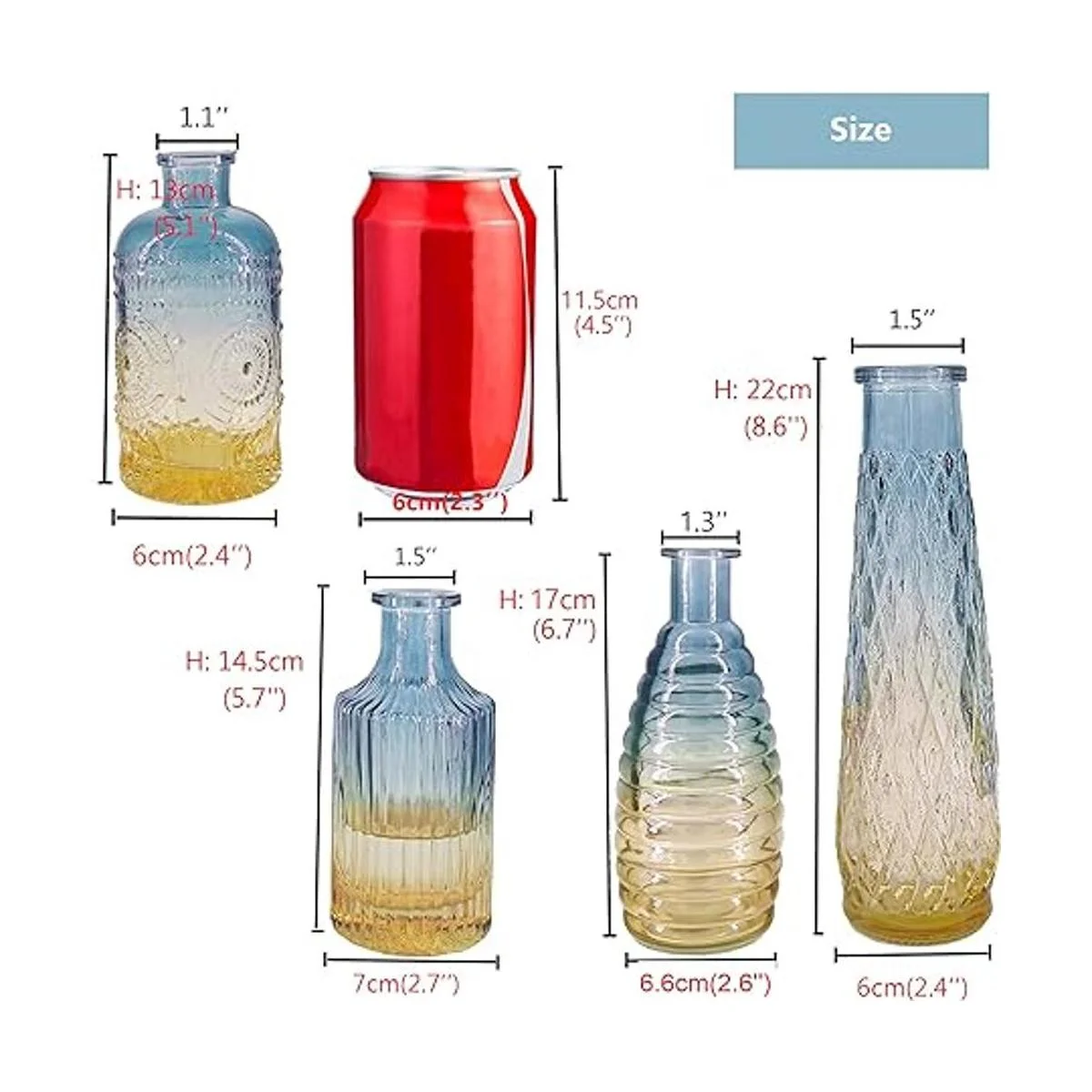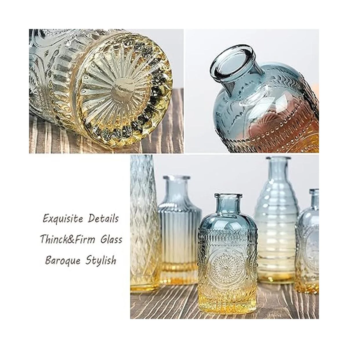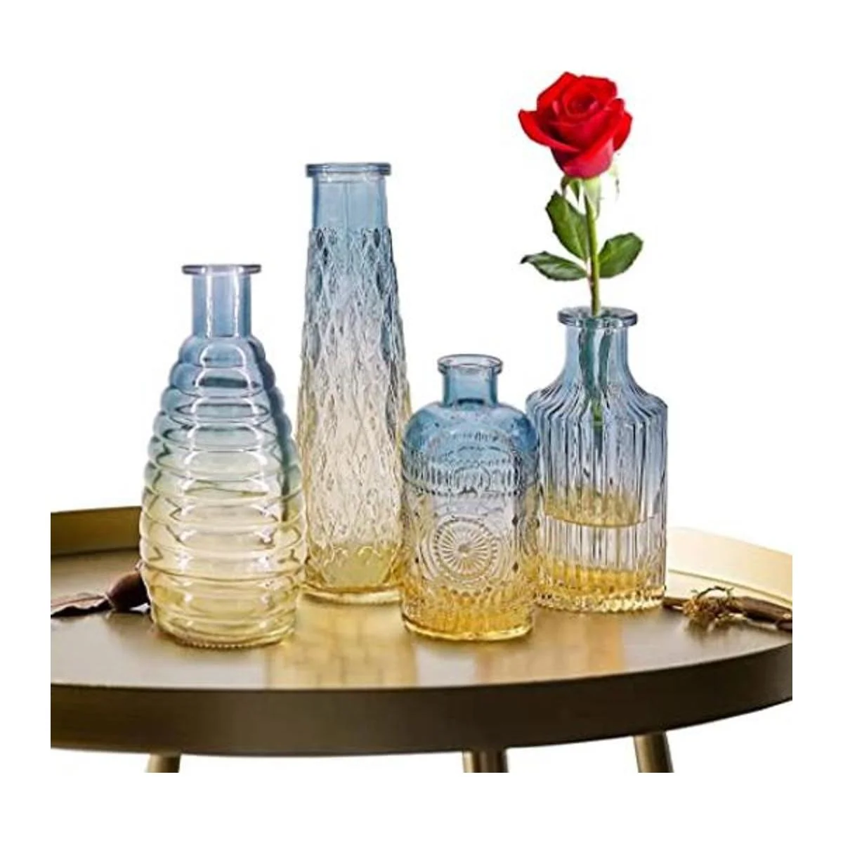 FANTESTICRYAN Juego de 4 floreros barrocos de vidrio degradado retro con brote de flores, pequeño soporte vintage para decoración floral de centro de mesa, decoración del hogar, boda, inauguración de la casa azul