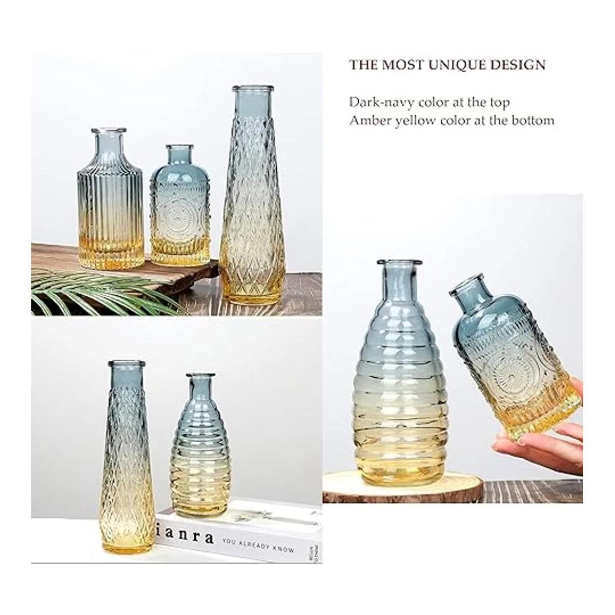 Estilo retro barroco: los jarrones de flores azules en relieve adoptan un tono de acento degradado único: desde azul marino en la parte superior hasta la parte inferior ámbar. Los jarrones transparentes vibrantes de colores reflejan bien las luces, pueden iluminar cualquier espacio y dar una sensación lujosa pero relajada.
