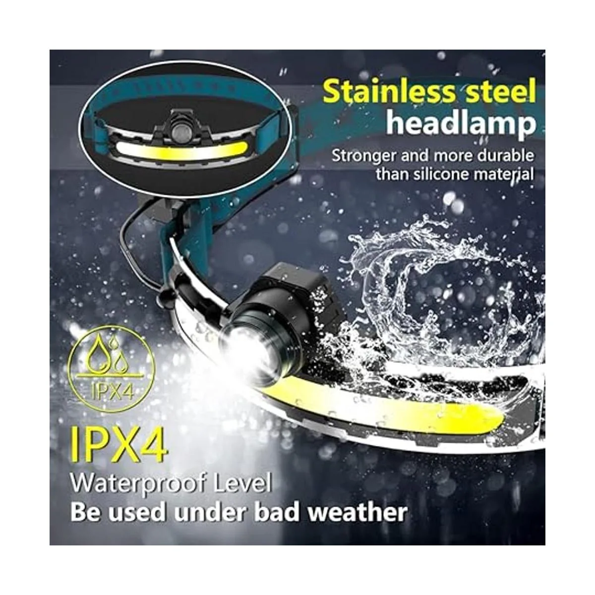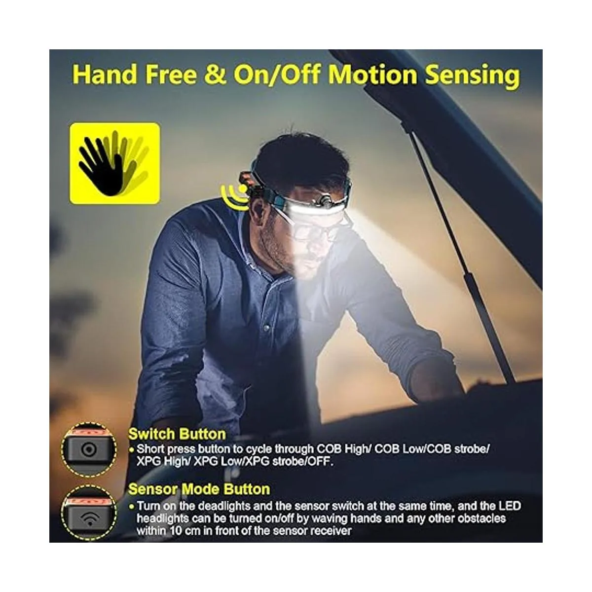 Sensor de movimiento y fácil de usar: la linterna brillante para faros delanteros tiene un sensor de movimiento de alta calidad. Cuando el interruptor de función del sensor está encendido, puedes encender/apagar la luz simplemente agitando tu mano dentro del rango de función del sensor. Ya sea que estés haciendo senderismo, ciclismo o reparando automóviles, el modo de sensor de movimiento sensible te dará comodidad.