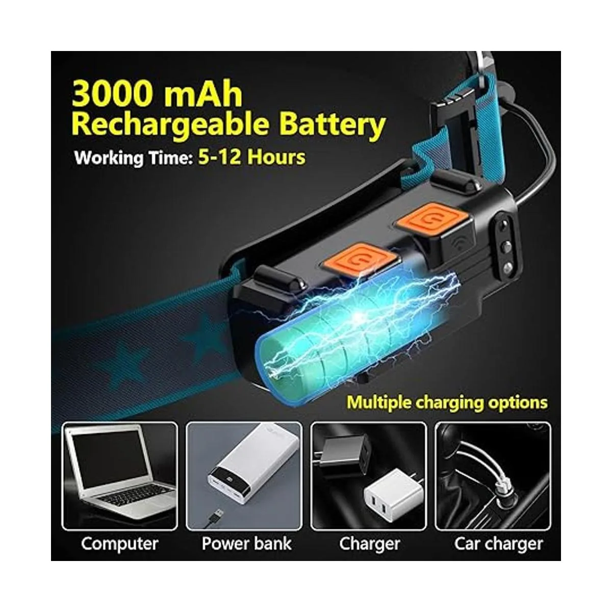 Recargable y largo tiempo de funcionamiento: faro recargable integrado con batería de litio de alta capacidad de 3000 mAh, puede durar de 5 a 12 horas de iluminación, se puede cargar a través del cable de carga rápida tipo C incluido, sin necesidad de comprar baterías adicionales. Y con el indicador de alimentación restante de la batería, puedes entender claramente la energía restante para garantizar una carga oportuna.