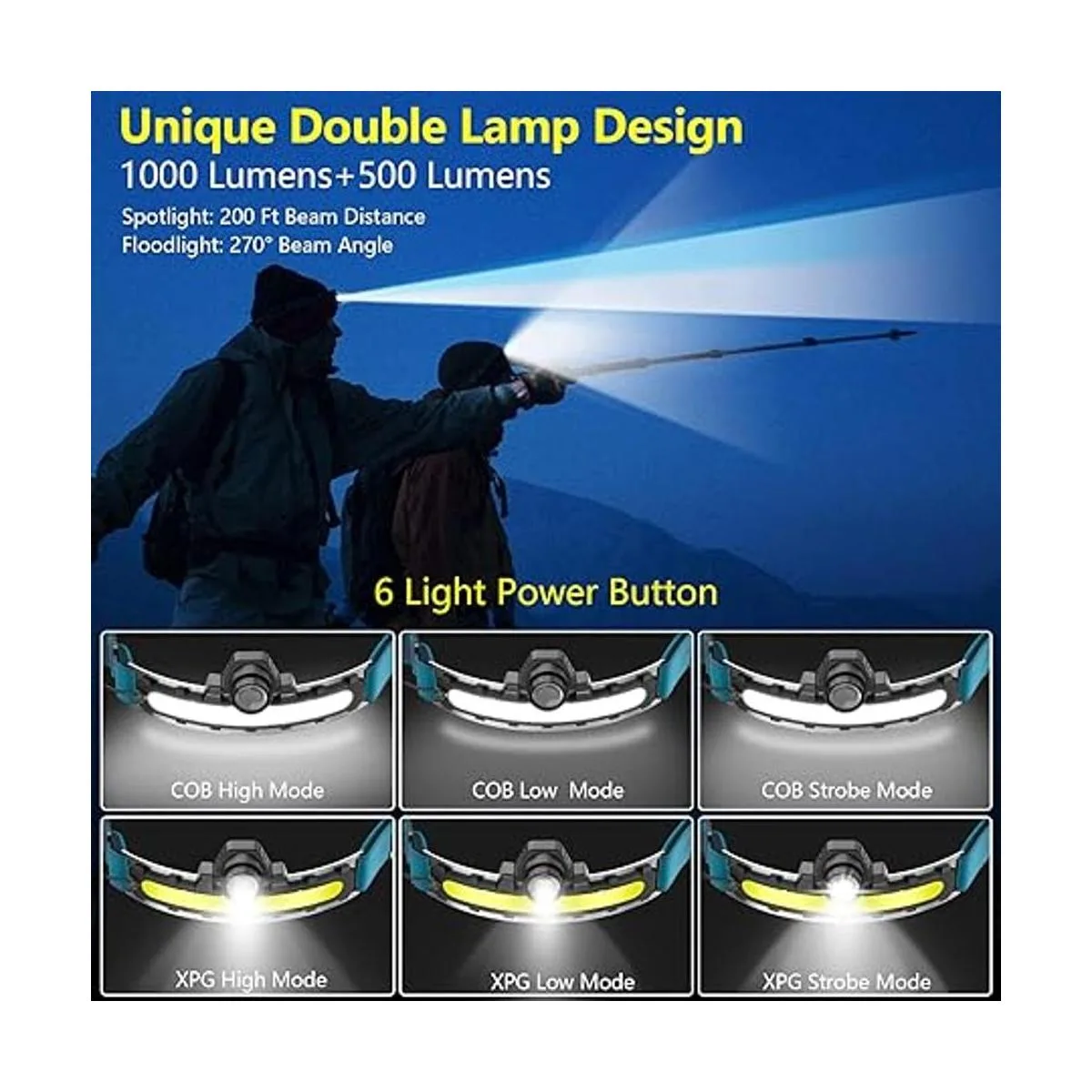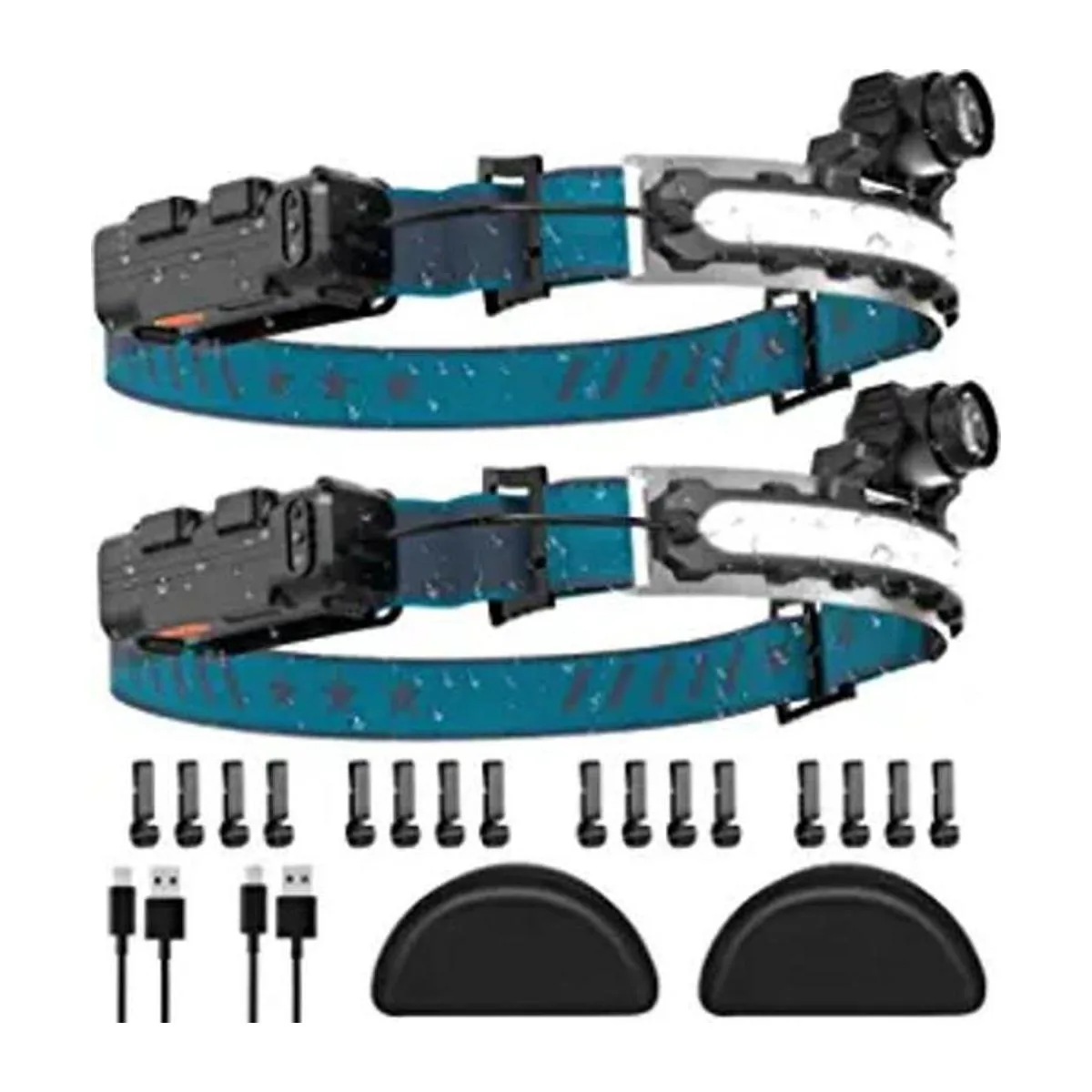 Faro frontal LED recargable, súper brillante de 1000 lúmenes de 270 de haz ancho con sensor de movimiento, 6 modos de iluminación, lámpara de cabeza impermeable IPX4 adecuada para campamento, senderismo, trabajo, faro de sombrero duro, 2 unidades