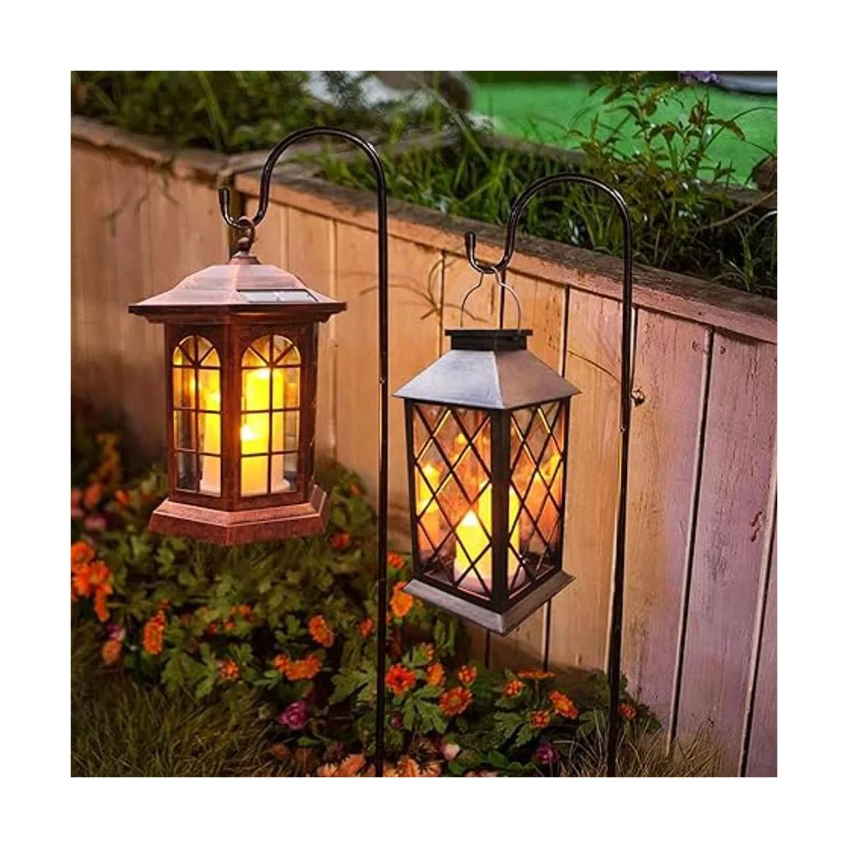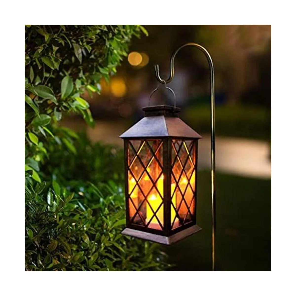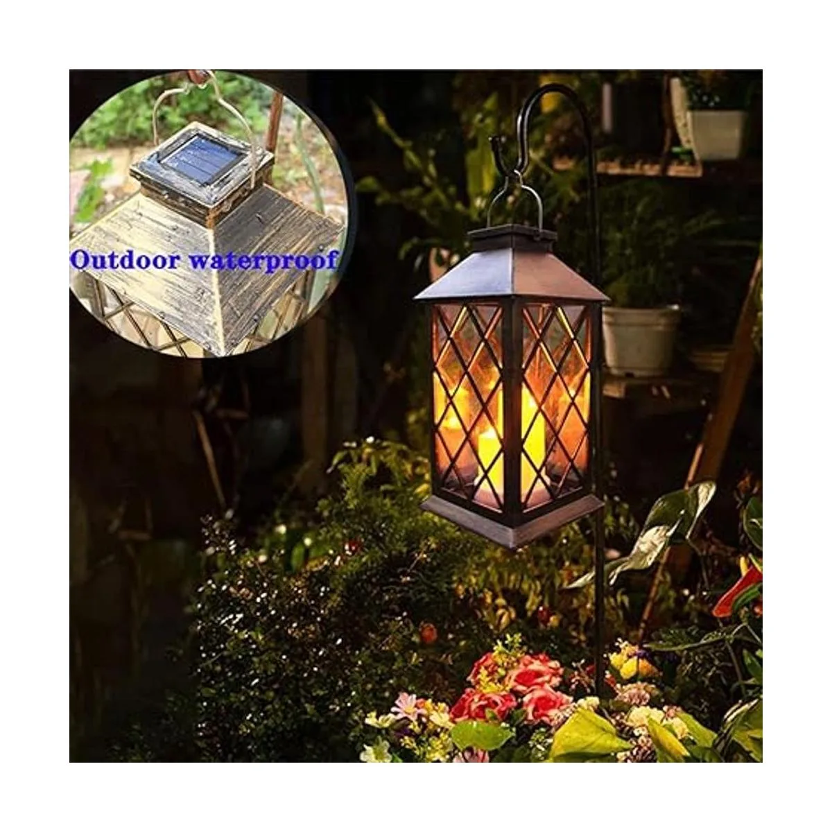 Fácil de usar : cada linterna de vela está equipada con un gancho S, por lo que no solo puedes ponerla en la mesa, sino también colgarla en un gancho de pastor. Esta hermosa linterna solar es perfecta para el jardín.