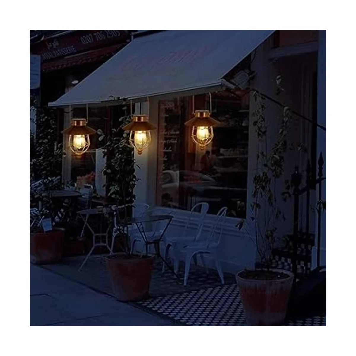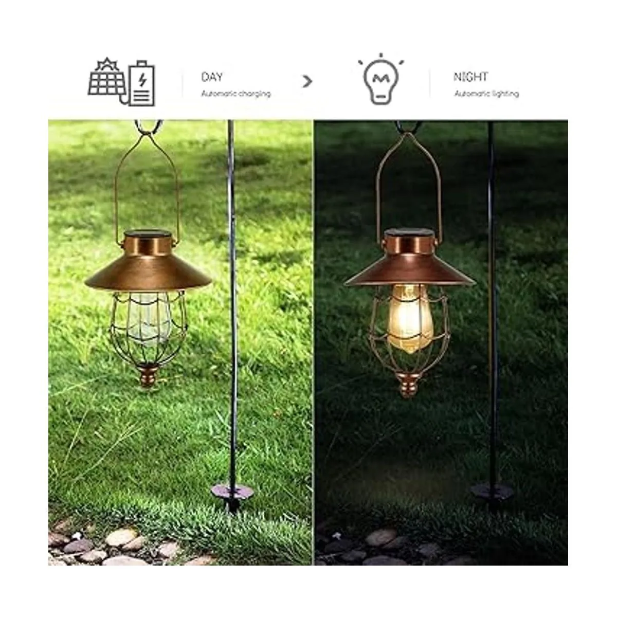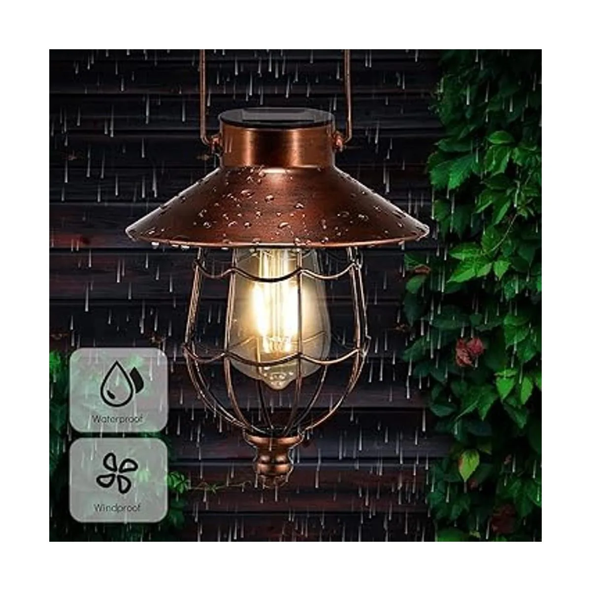 Resistencia a la intemperie: linternas solares colgantes al aire libre IP44 diseño impermeable, de acuerdo con la información reflejada por la mayoría de los clientes, el diseño impermeable se ha actualizado, y hay un anillo impermeable debajo del panel solar, adecuado para un entorno exterior a largo plazo. La pintura de bronce en el exterior de la bombilla evita el óxido.