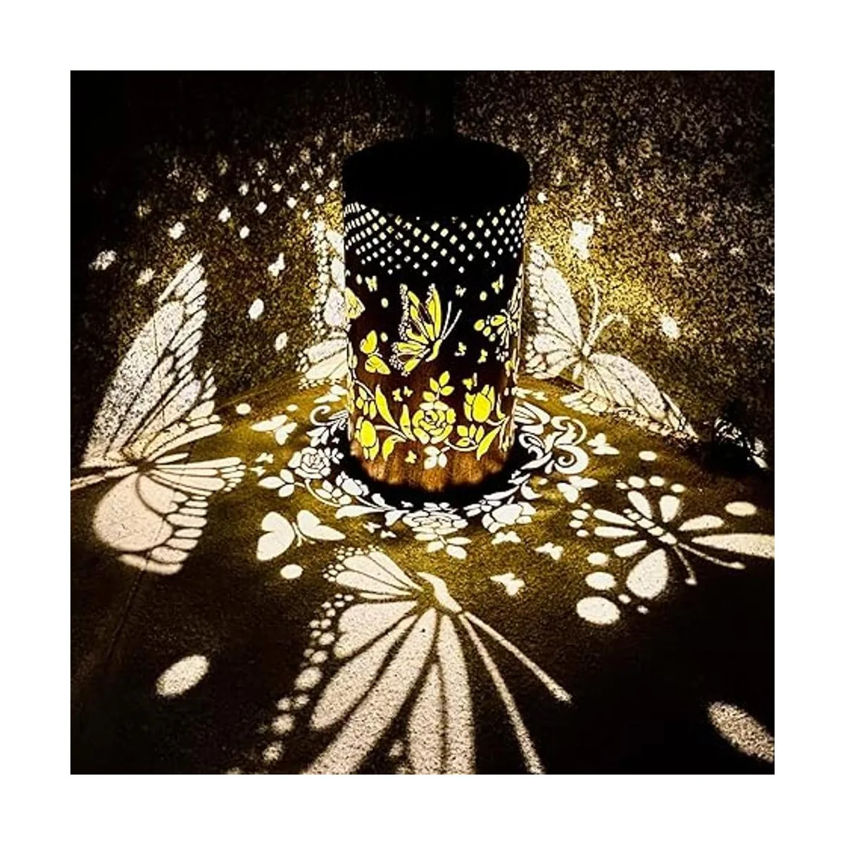 Hermosa e imaginativa decoración de jardín: fusiona el oro retro, el cobre de los exteriores y el patrón irregular en el interior, en la oscuridad, la linterna solar emite una luz brillante y cálida con patrón de mariposa, que parece un vuelo de mariposa simboliza el cambio.