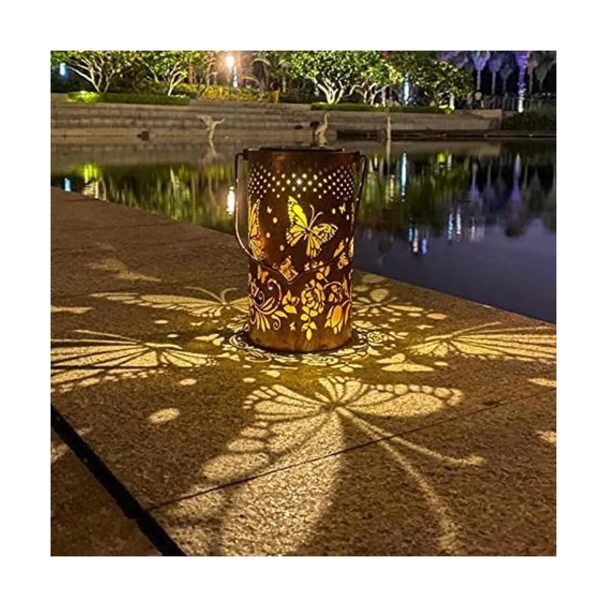 Faroles solares colgantes para exteriores, linterna de decoración de metal ahuecada con mariposa, luz LED impermeable decorativa para jardín, decoración delicada de jardín para patio, camino, paisaje