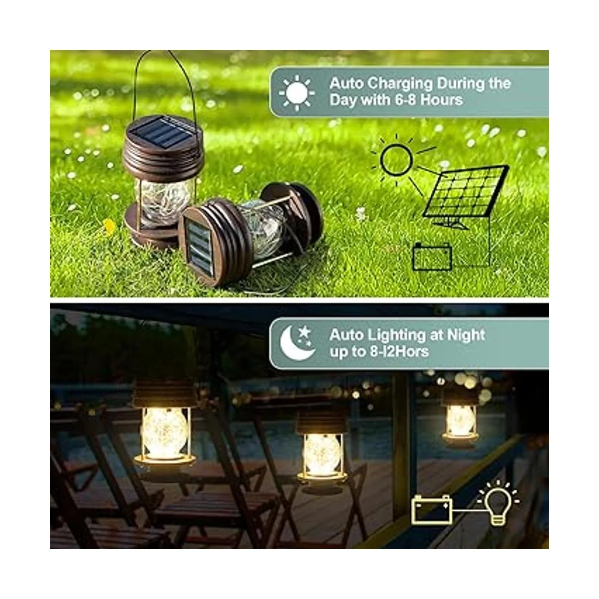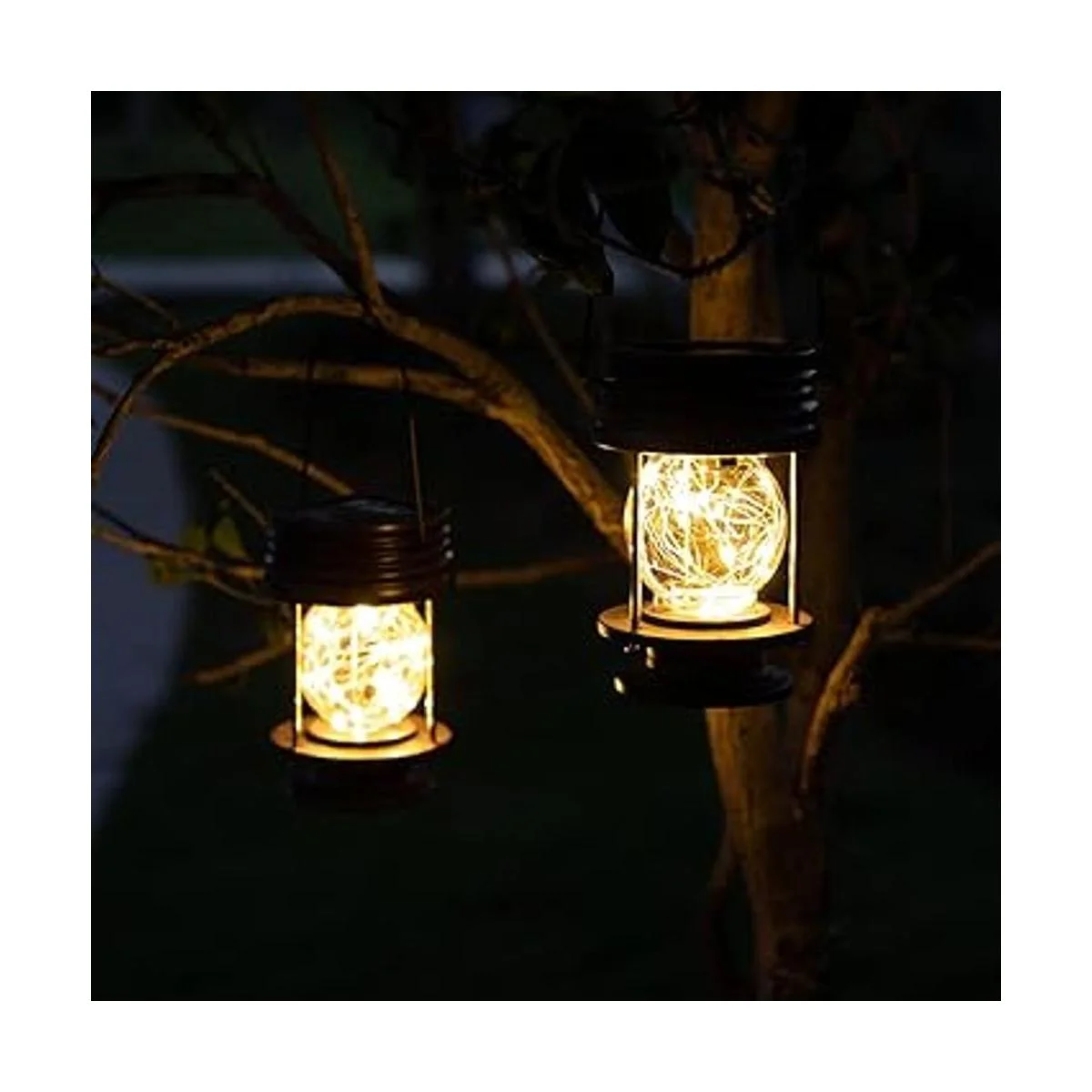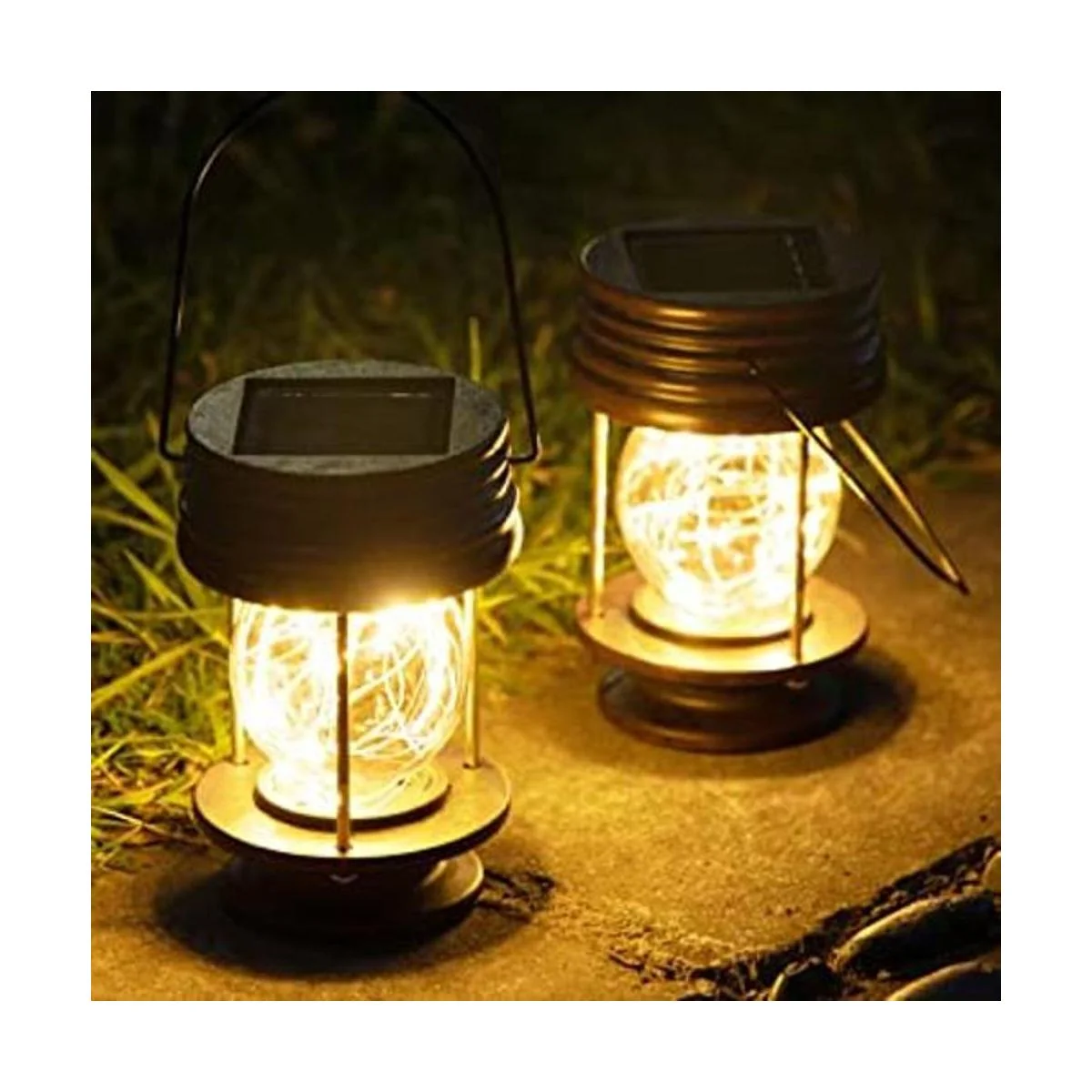 Faroles solares impermeables para colgar al aire libre, paquete de 2 luces LED decorativas solares de paisaje con diseño retro, luces LED cálidas para mesa interior, patio, jardín y camino