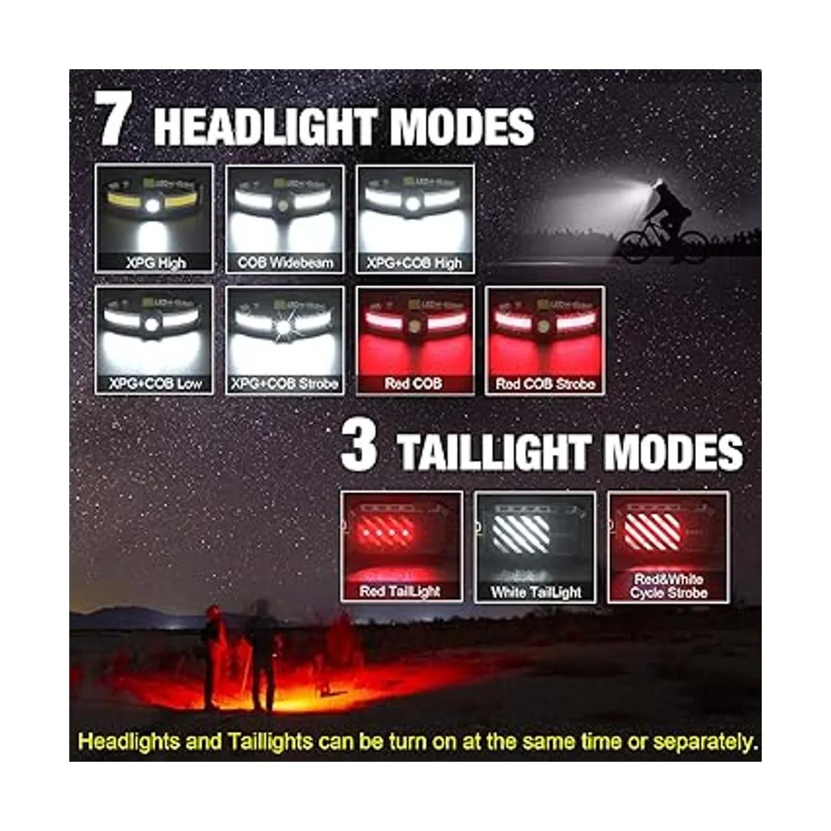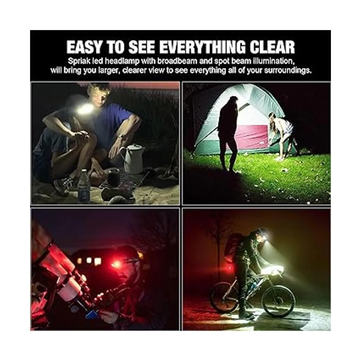 Faro de luz ancha superbrillante: la linterna de faros recargable LED Spriak es de 1000 lúmenes, cuenta con luz LED de punto, luz LED para la cabeza, luz trasera roja, es mucho más brillante y útil que el faro tradicional. Puede iluminar una gran área a tu alrededor, al mismo tiempo centrarse en objetos frente a ti, la luz trasera roja de seguridad puede garantizar que las personas y los animales puedan ver tu presencia, evitar peligrosos a tiempo. Adecuado para cualquier situación, correr, senderismo, camping, mantenimiento mecánico.