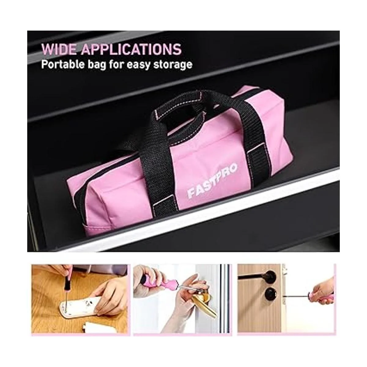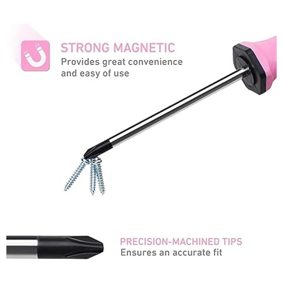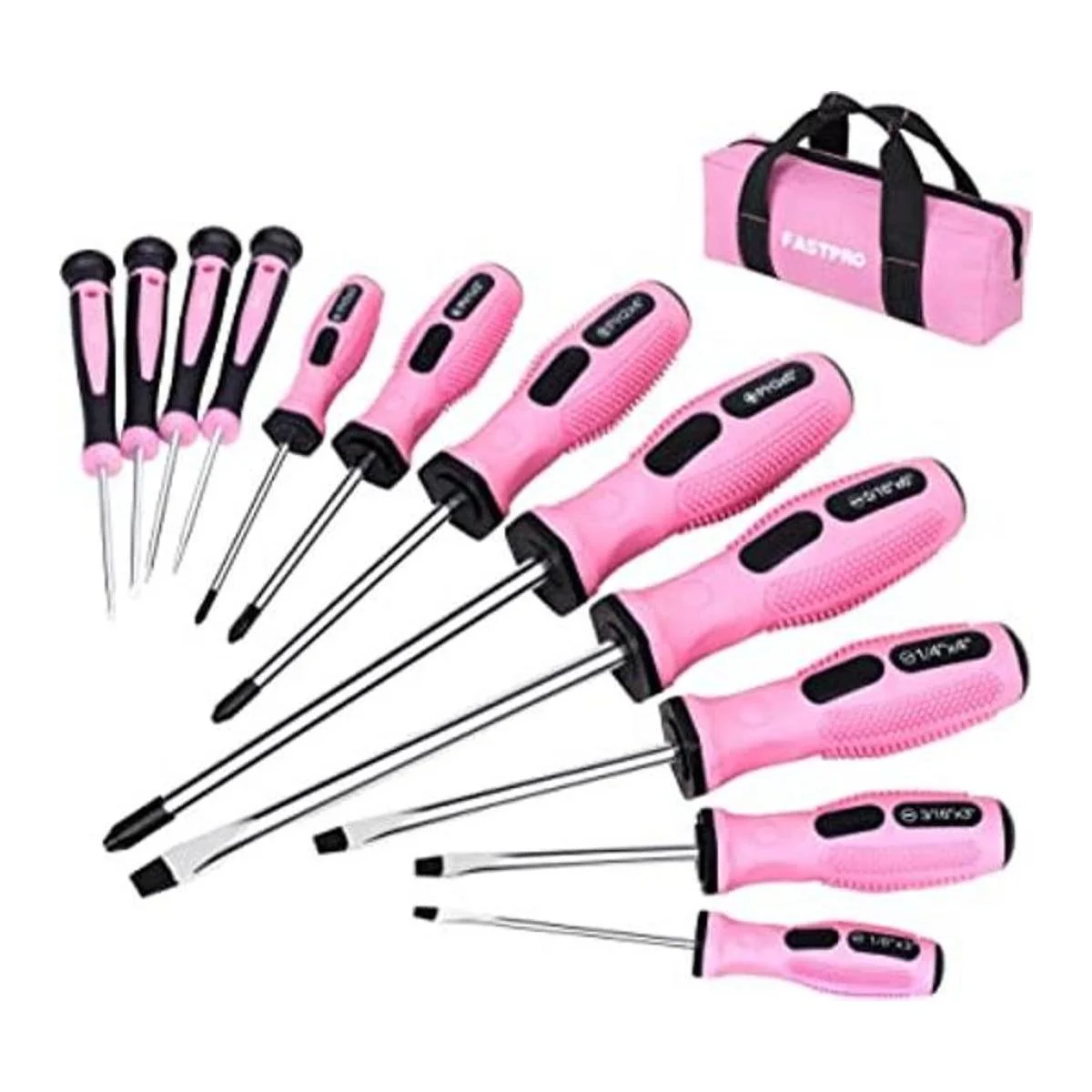 FASTPRO Juego de destornilladores magnéticos rosados de 12 piezas con destornilladores Phillips ranurados y destornilladores de precisión, kit de herramientas de reparación para mujeres con bolsa de almacenamiento