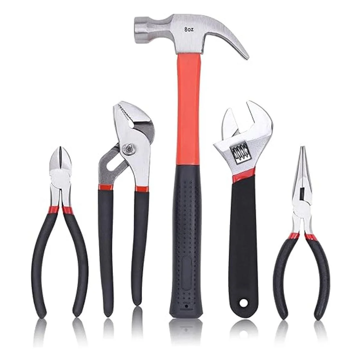 Incluye alicates de junta deslizante, alicates de junta de ranura, llave ajustable, alicates de punta larga, soporte de destornillador magnético, puntas de destornillador, cuchillo de utilidad, cinta métrica.