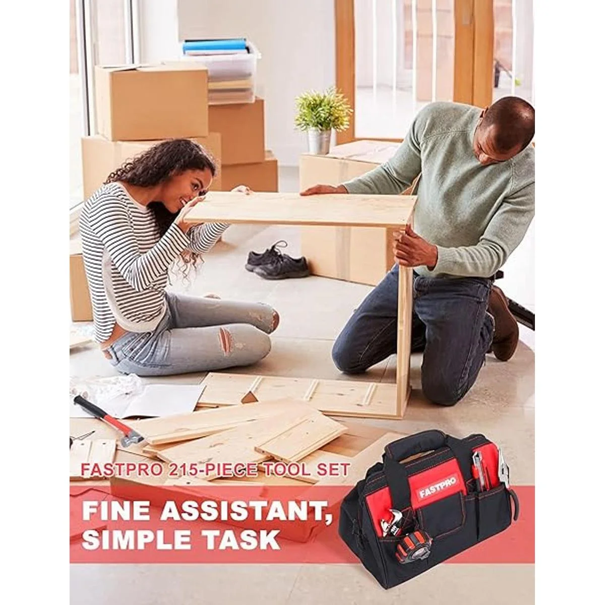 FASTPRO Juego de herramientas de reparación para el hogar de 215 piezas con bolsa de almacenamiento abierta de boca de 12 pulgadas de ancho, kit de herramientas manuales para el hogar