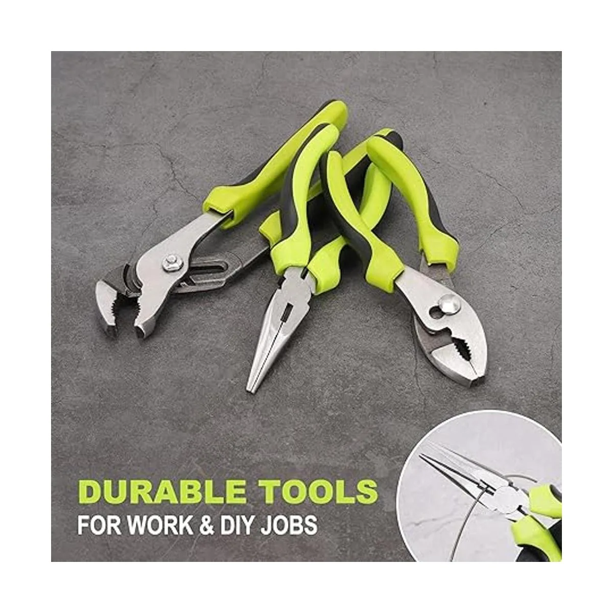 Incluye alicates de junta deslizante, alicates de junta de ranura, llave ajustable, alicates de punta larga, soporte de destornillador magnético, puntas de destornillador, cuchillo utilitario, cinta métrica.