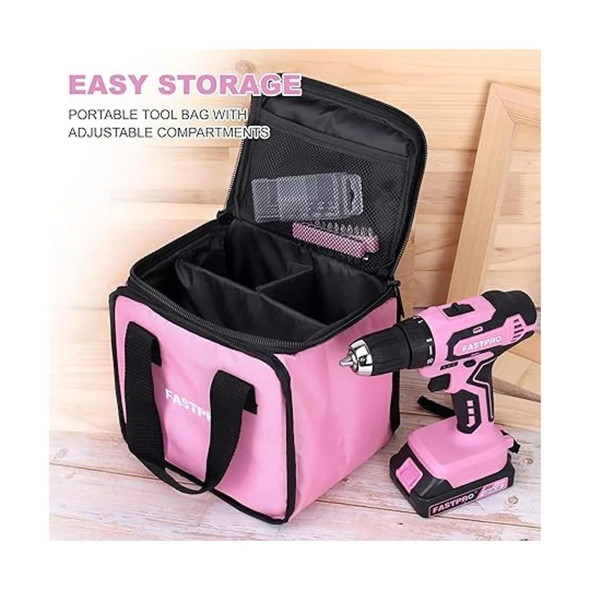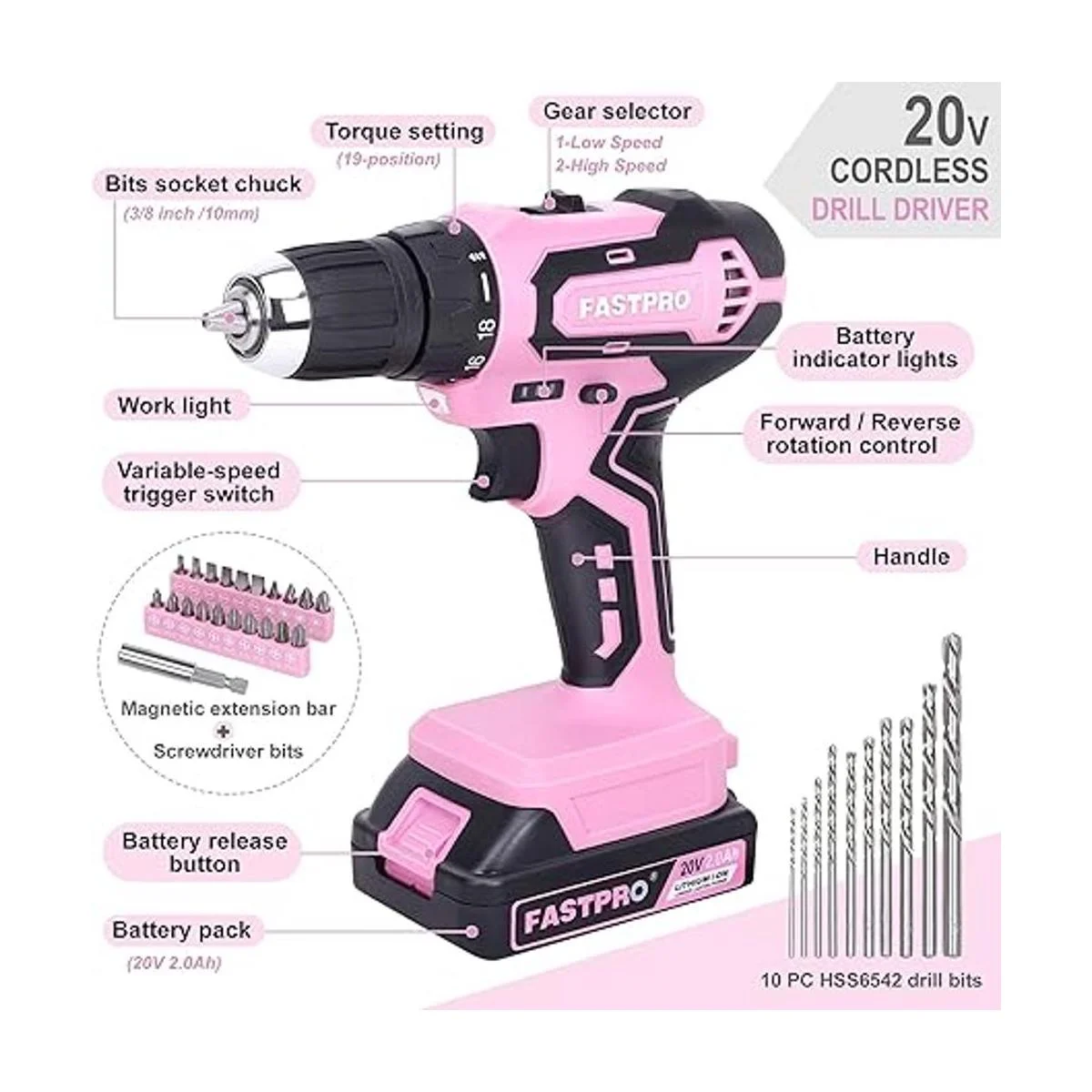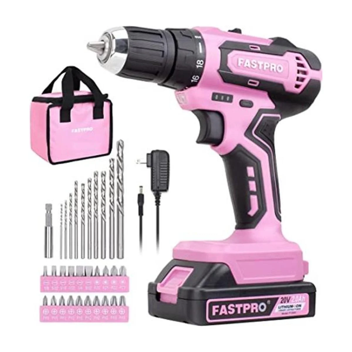 FASTPRO Juego de taladro rosa juego de taladro inalámbrico de iones de litio de 20 V máximo, kit de taladro de 38 pulgadas con una batería de 2.0 Ah, cargador y bolsa de herramientas