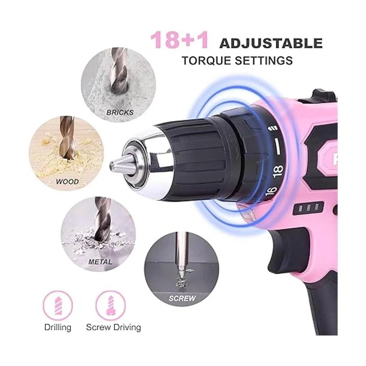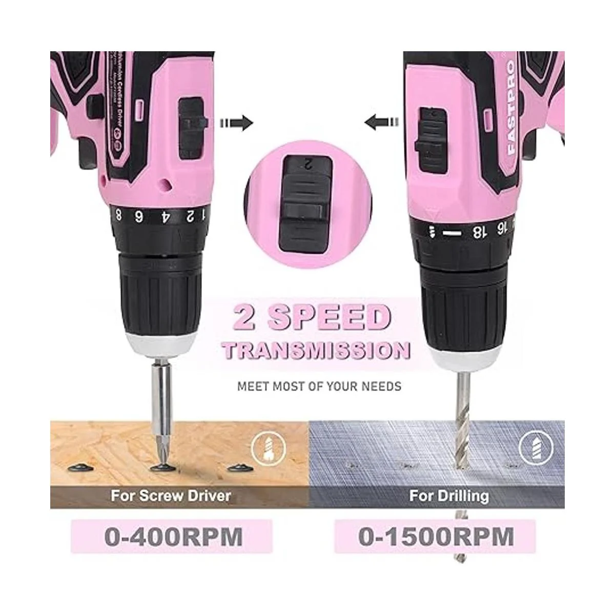Múltiples propósitos: el taladro inalámbrico cuenta con un 3/8 pulgadas. El portabrocas sin llave con un embrague de 19 posiciones ajusta la salida de torsión para controlar la profundidad del tornillo o sujetador. El taladro está diseñado con ajustes variables de 2 velocidades 0400 rpm y 01500 rpm para múltiples propósitos.