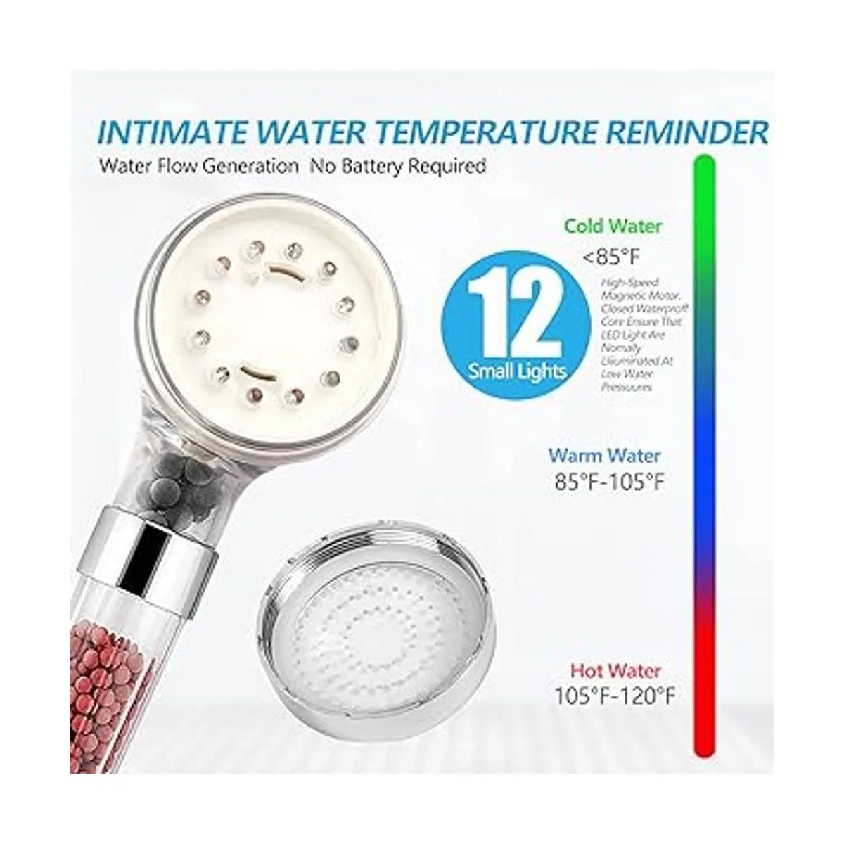 Sensor de temperatura del agua: el cabezal de ducha LED con manguera funciona con agua y no requiere pilas. El color de la luz LED cambia con la temperatura del agua 85 verde; 85105 azul; 105120 rojo. cuando la luz roja parpadea, significa calor alto superior a 120