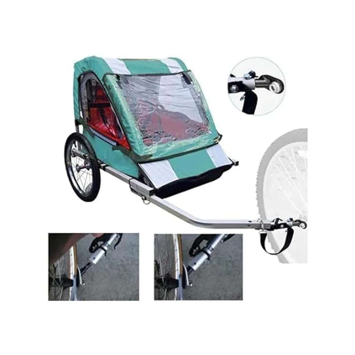 Compatible con la mayoría de bicicletas. Antes de comprar, ten en cuenta que el tamaño del diámetro del eje es de 0.6 pulgadas, comprueba que tu remolque se ajusta a él.
