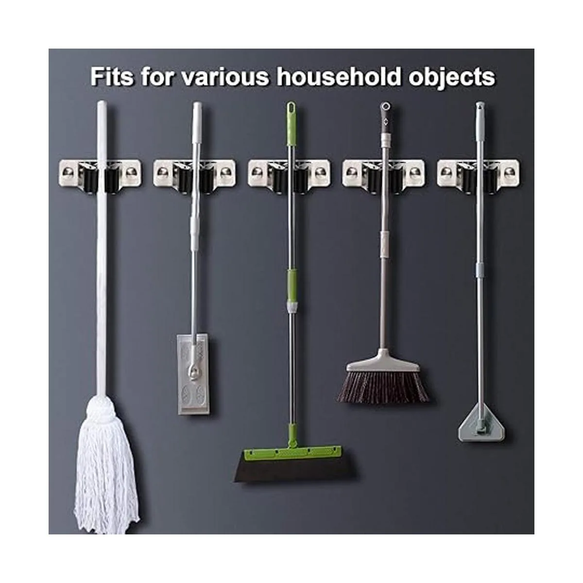 Ampliamente utilizado: puedes instalar este soporte de almacenamiento montado en la pared en cualquier superficie para colgar escobas, fregonas, estantes, llaves, paraguas, cepillos, recogedores, guantes, plumeros, bates de béisbol, etc.