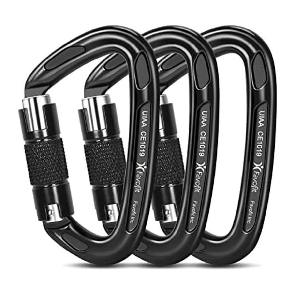 Favofit Mosquetones de escalada certificados UIAA, paquete de 3, 25 KN 5620 libras, clips de mosquetón de bloqueo grandes resistentes para escalada en rocahielo, columpio de rescate de rapel, etc., color negro