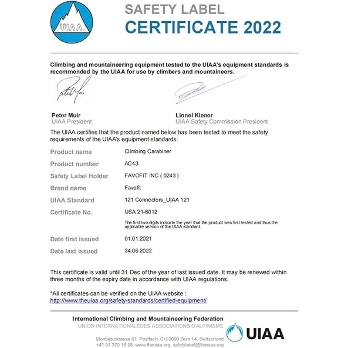 Certificado UIAA de alta resistencia: este mosquetón de escalada está certificado por la UIAA certificación No. : EE.UU. 205611 con límite de peso a 25 KN 5620 libras para eje principal, y a 7 KN 1573 libras para eje menor y puerta de bloqueo