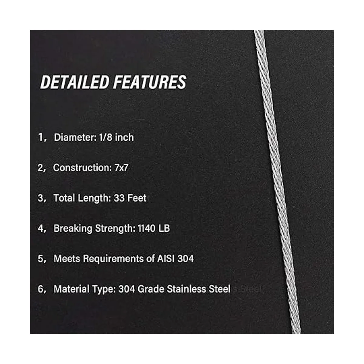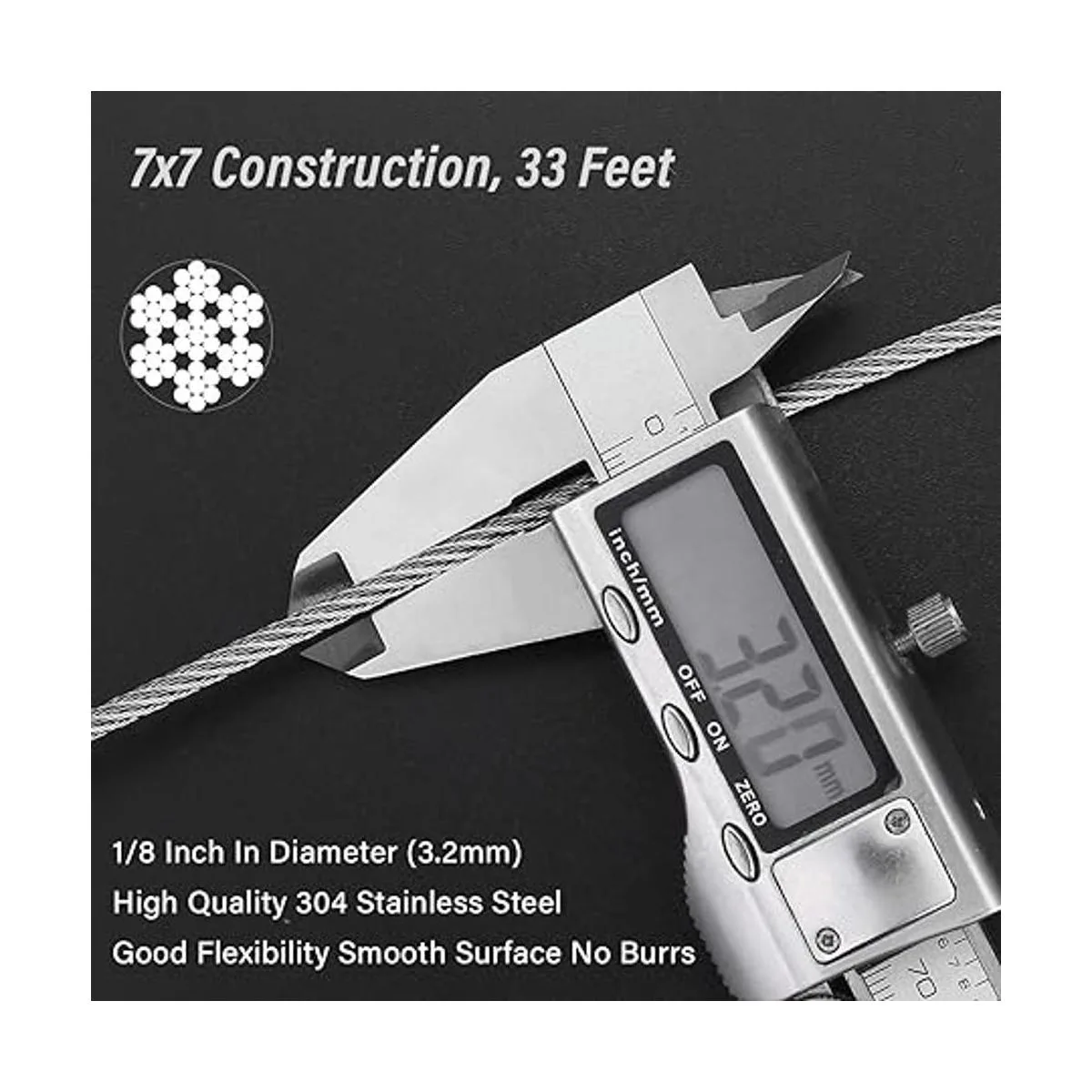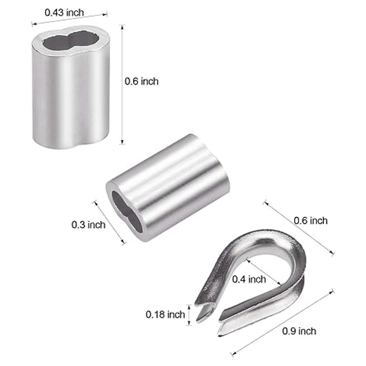 Tamaño Cable de alambre: 1/8 pulgadas de diámetro y 33 pies de longitud. Manguito de aluminio y dedal de cuerda de alambre para cable de alambre de 1/8 pulgadas de diámetro.